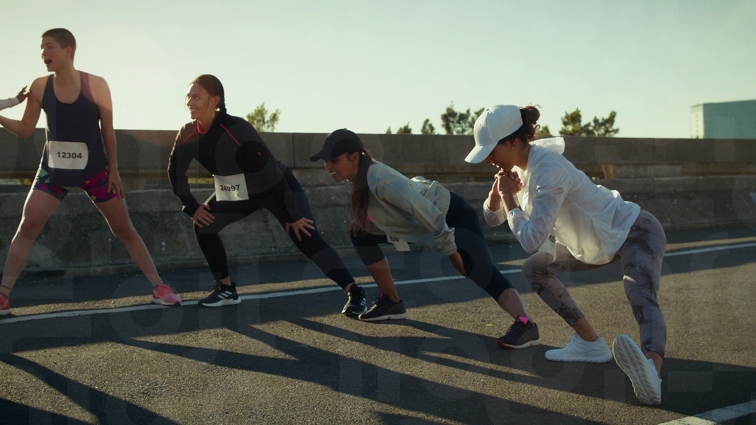 Group of determined runners performing warm-up stretches together on a road. They are preparing for a race, focusing on fitness and wellbeing. Sunny day.