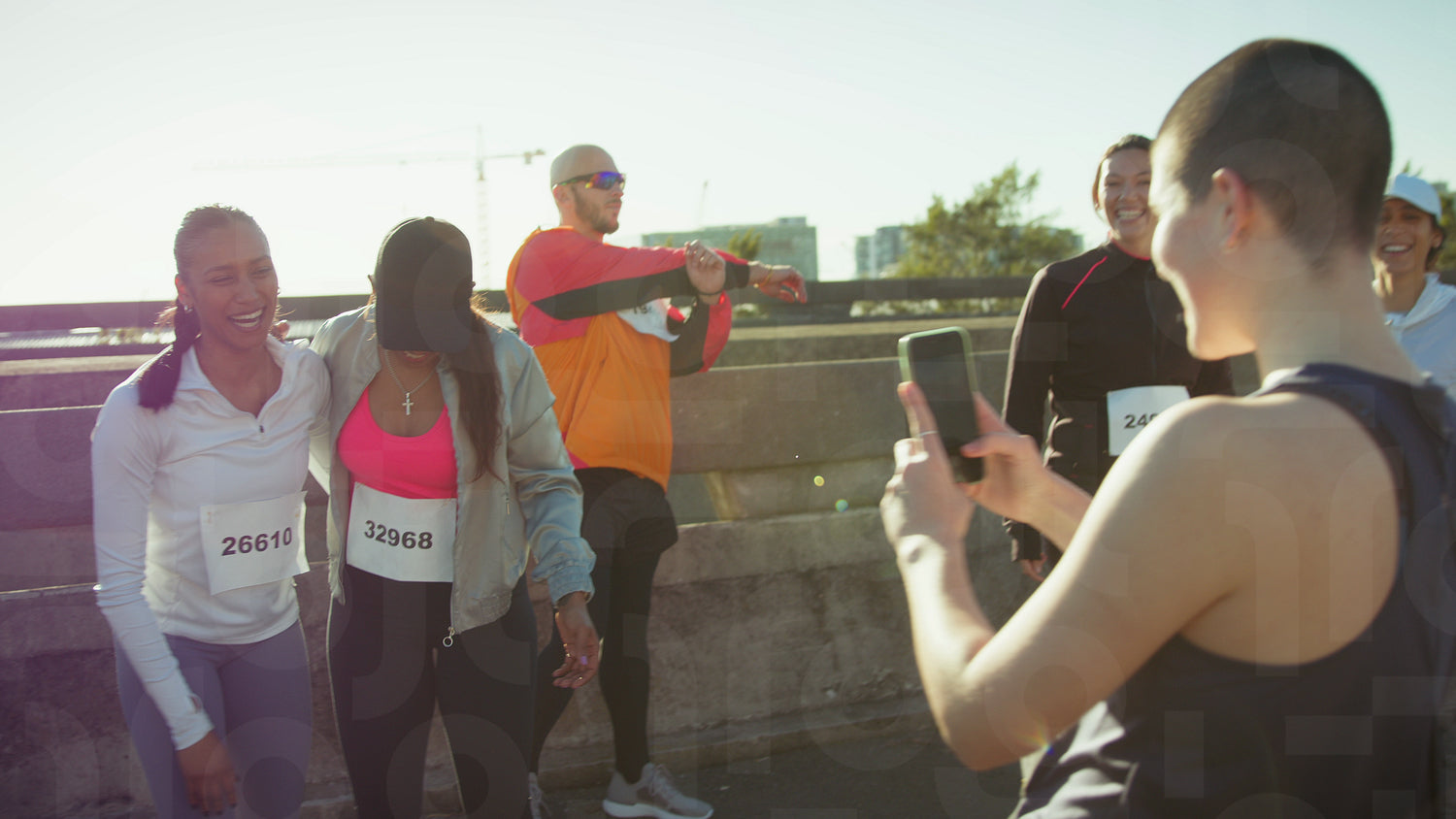 Group of happy runners pose for a photo on a bridge before a race, showing teamwork and excitement for the event.