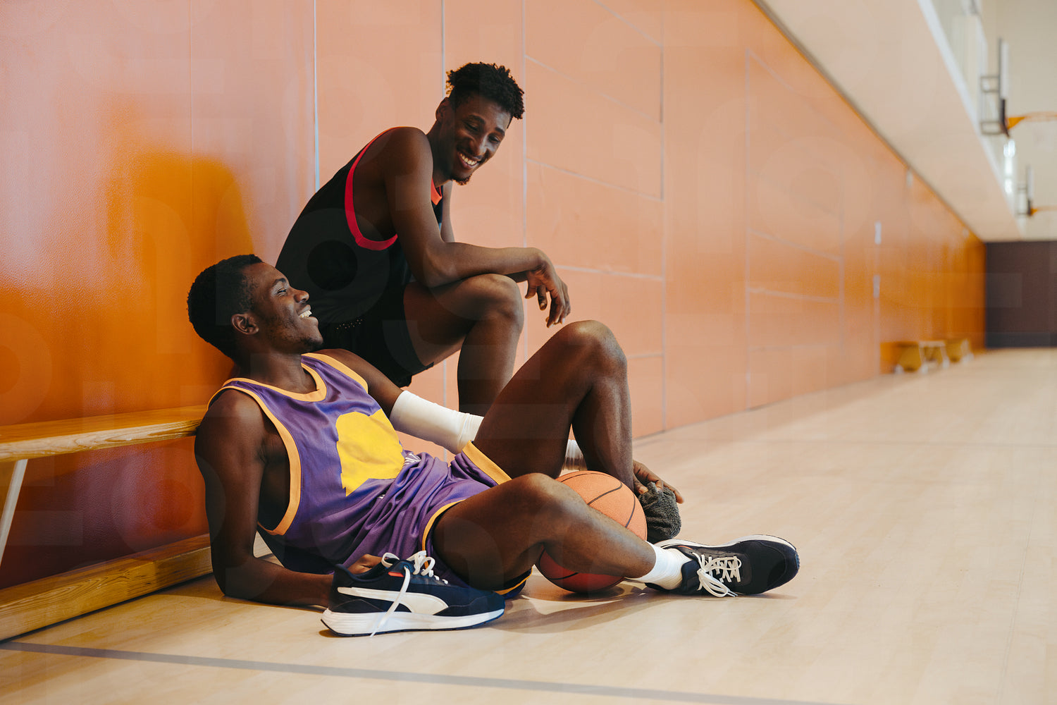 Two opposing basketball players sitting on the sidelines of an indoor court, sharing a friendly conversation as one rests with a foot injury, reflecting camaraderie and sportsmanship