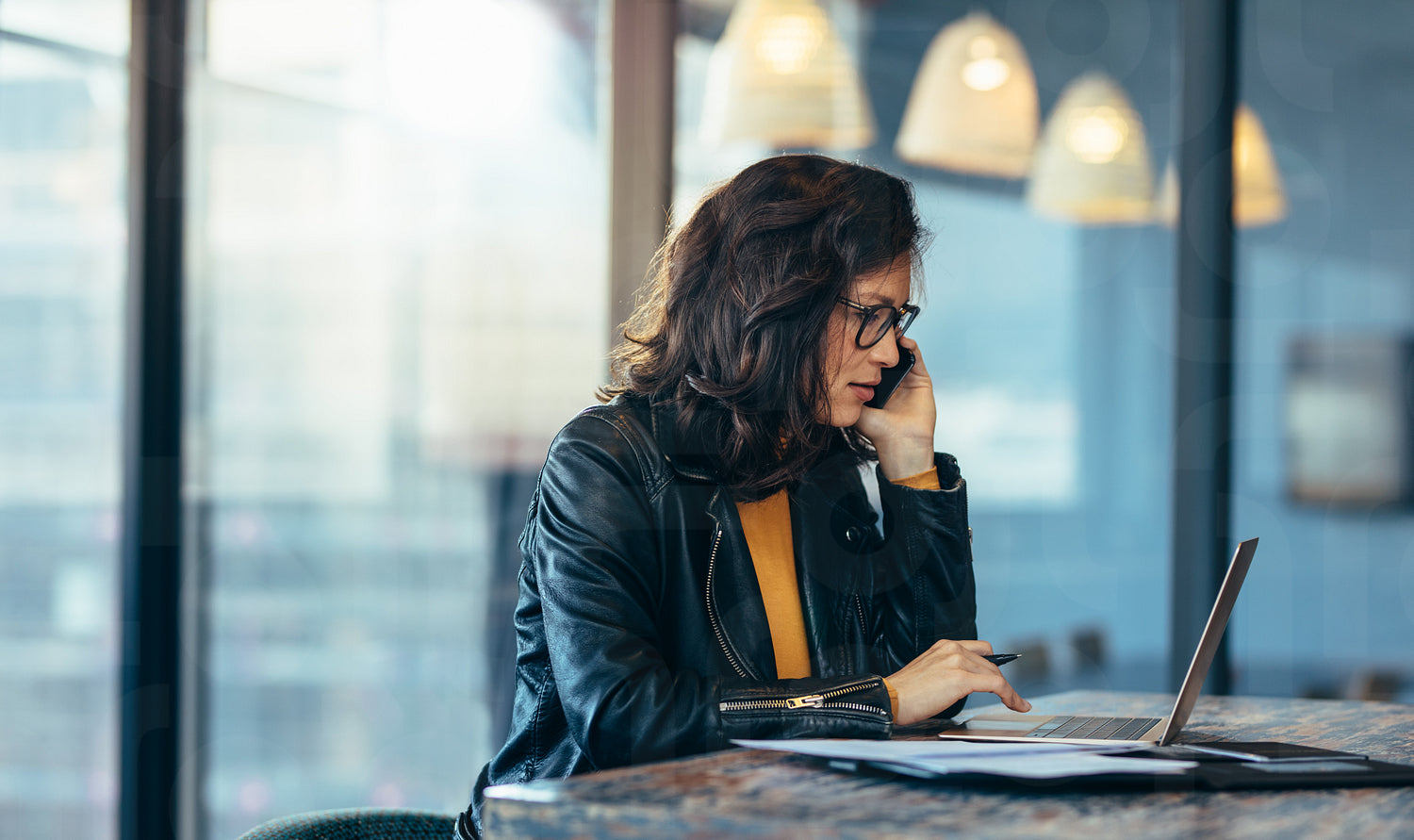 Business woman sitting working at office and talking on mobile phone. Business woman busy working at her desk.