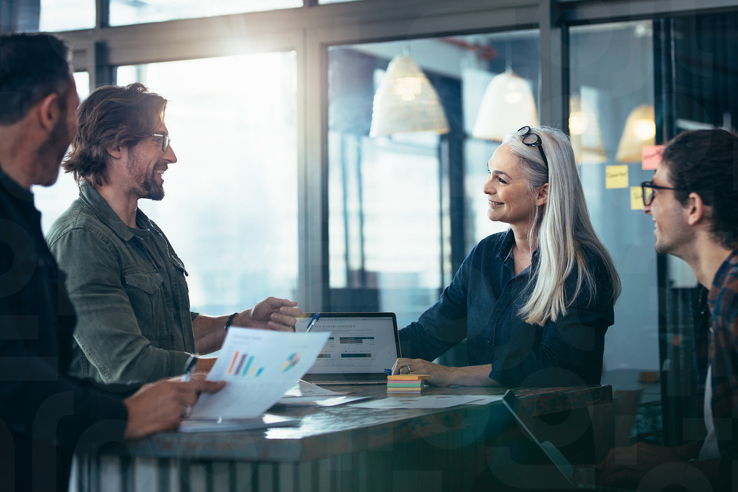 Group of business people meeting around a table. Brainstorming over new business ideas. Business team with charts meeting in office.