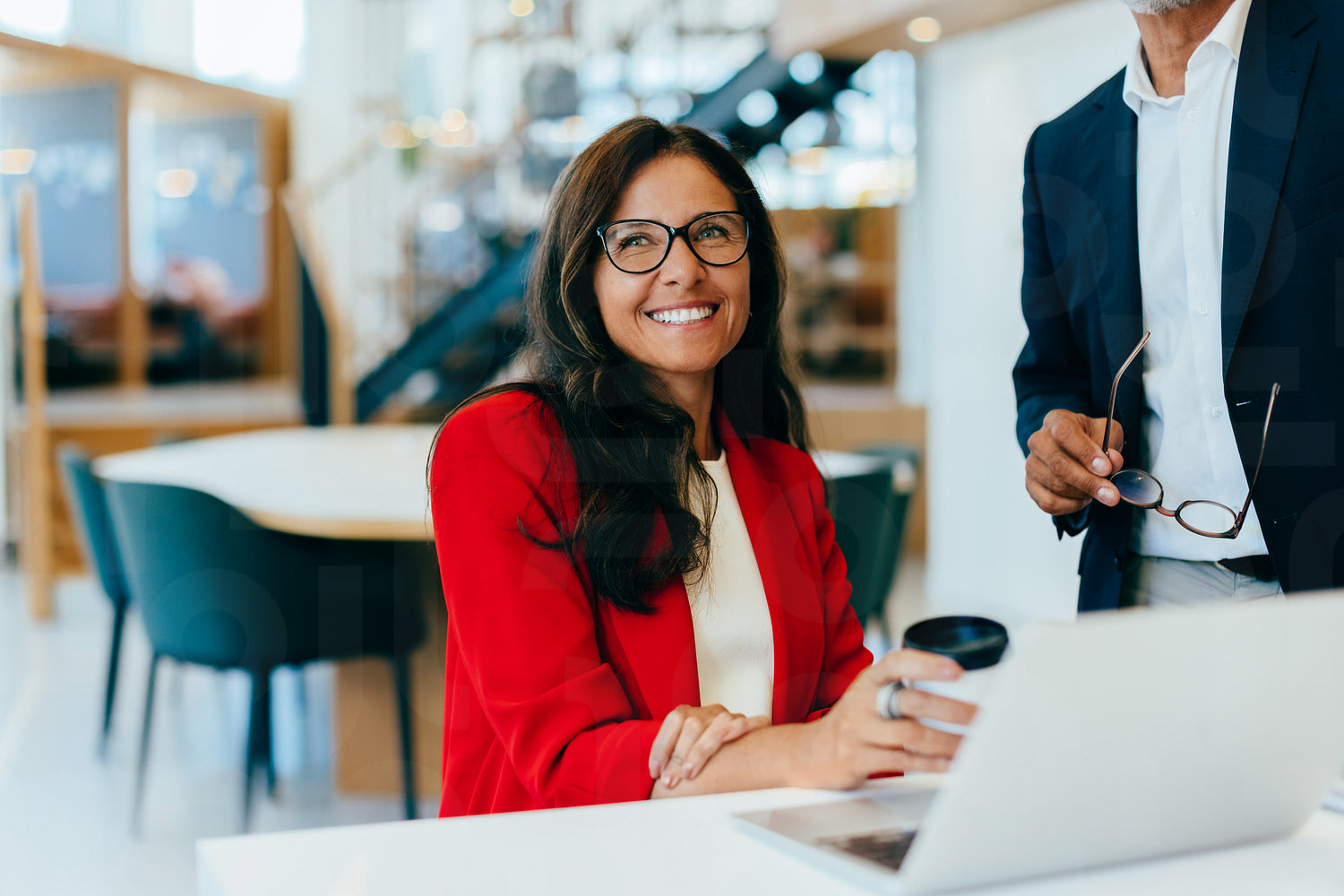 A confident woman in business attire is working in an office environment, exuding positivity and professionalism, symbolizing workplace success, collaboration, and leadership in a corporate setting.