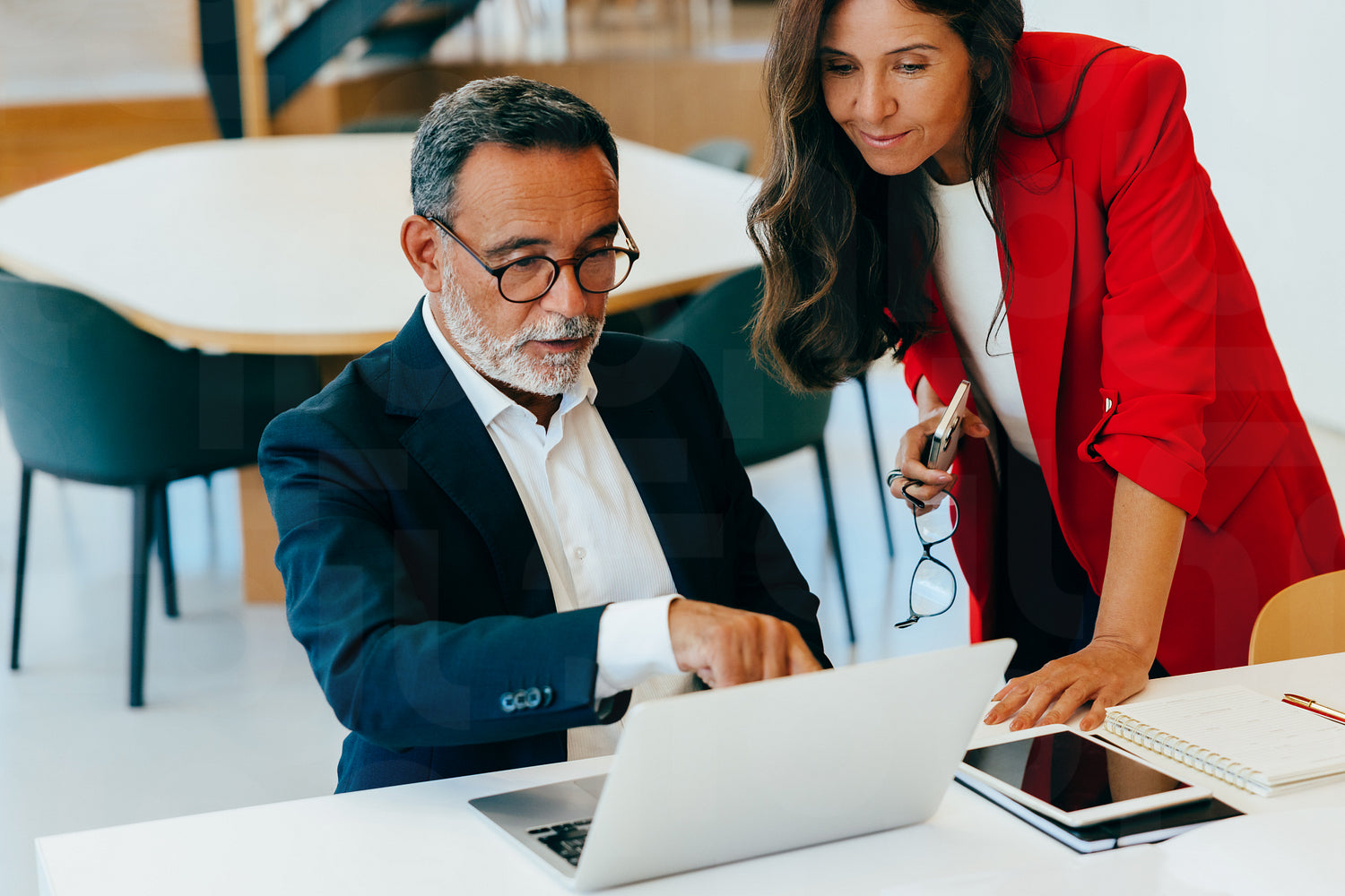 Two senior professionals, a man and a woman, analyzing data on a laptop, showcasing communication and leadership in a business environment. They are engaged in thoughtful discussion and planning.