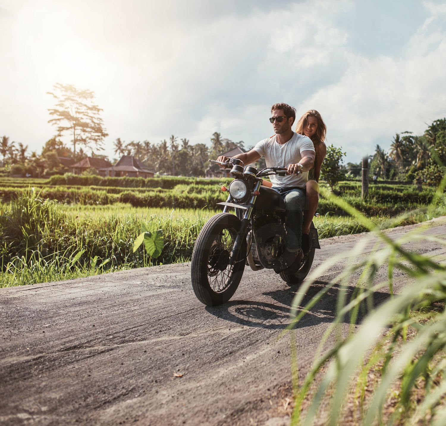 Outdoor shot of couple on motorbike driving through country road. Man and woman riding motorcycle on a countryside road.