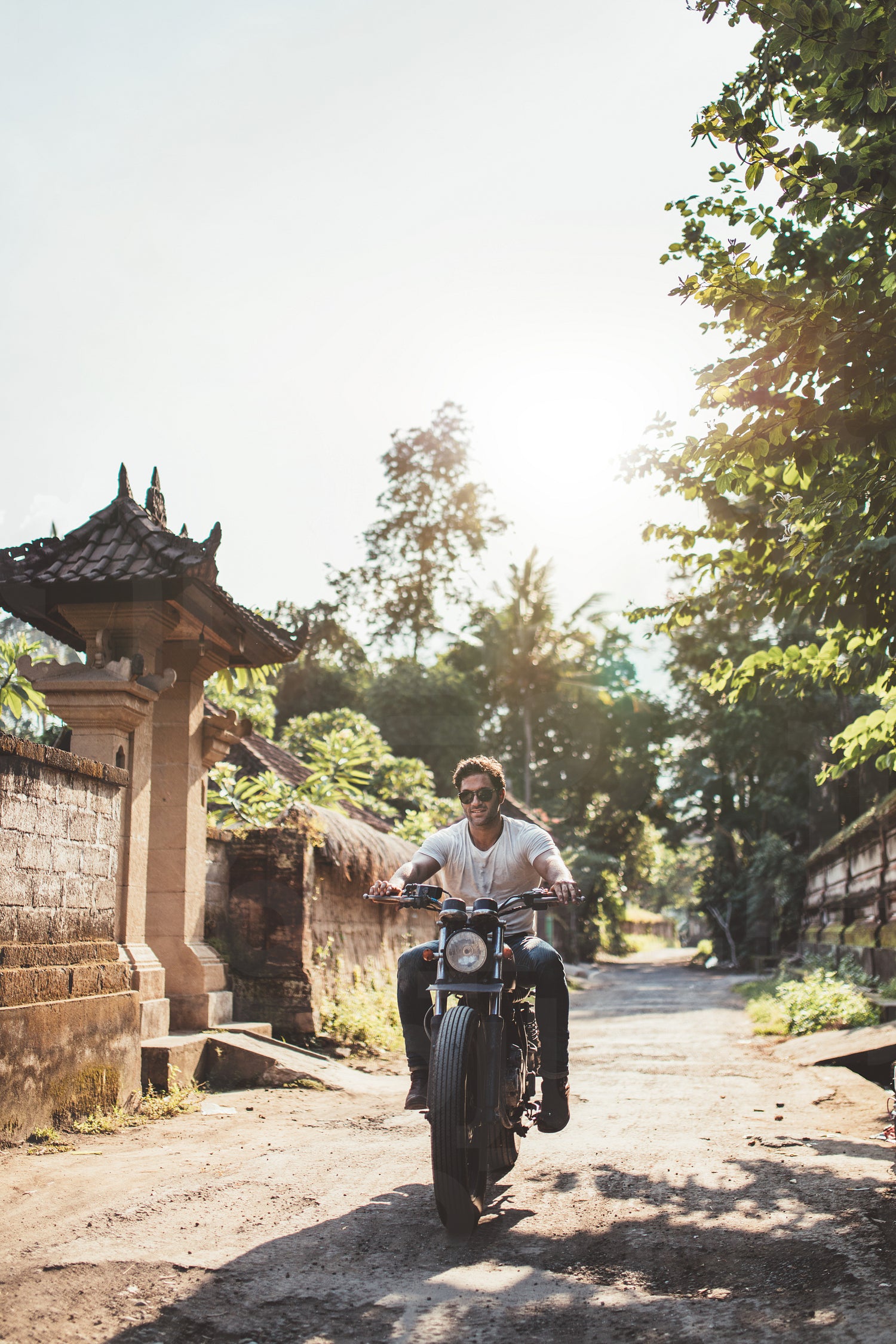 Vertical shot of young man riding motorcycle with her girlfriend through a village road. Couple out on a motorbike ride.