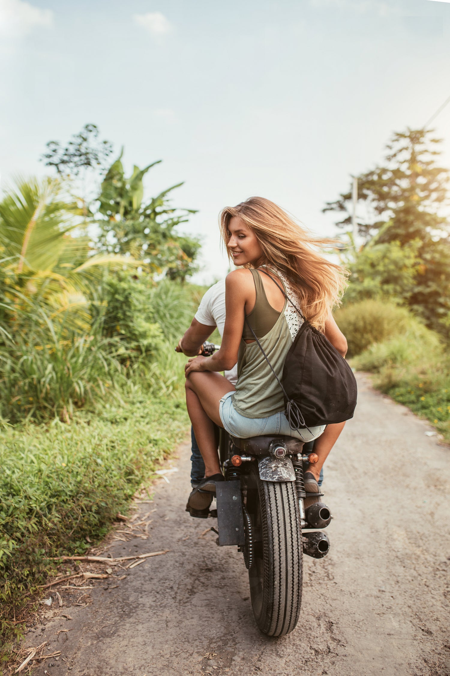 Rear view shot of young couple riding motorbike on dirt road. Beautiful young woman sitting on back of her boyfriend riding motorcycle.