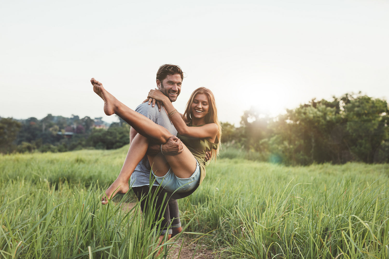 Shot of young man carrying his girlfriend through grass field. Romantic young couple having fun in nature on a summer day.