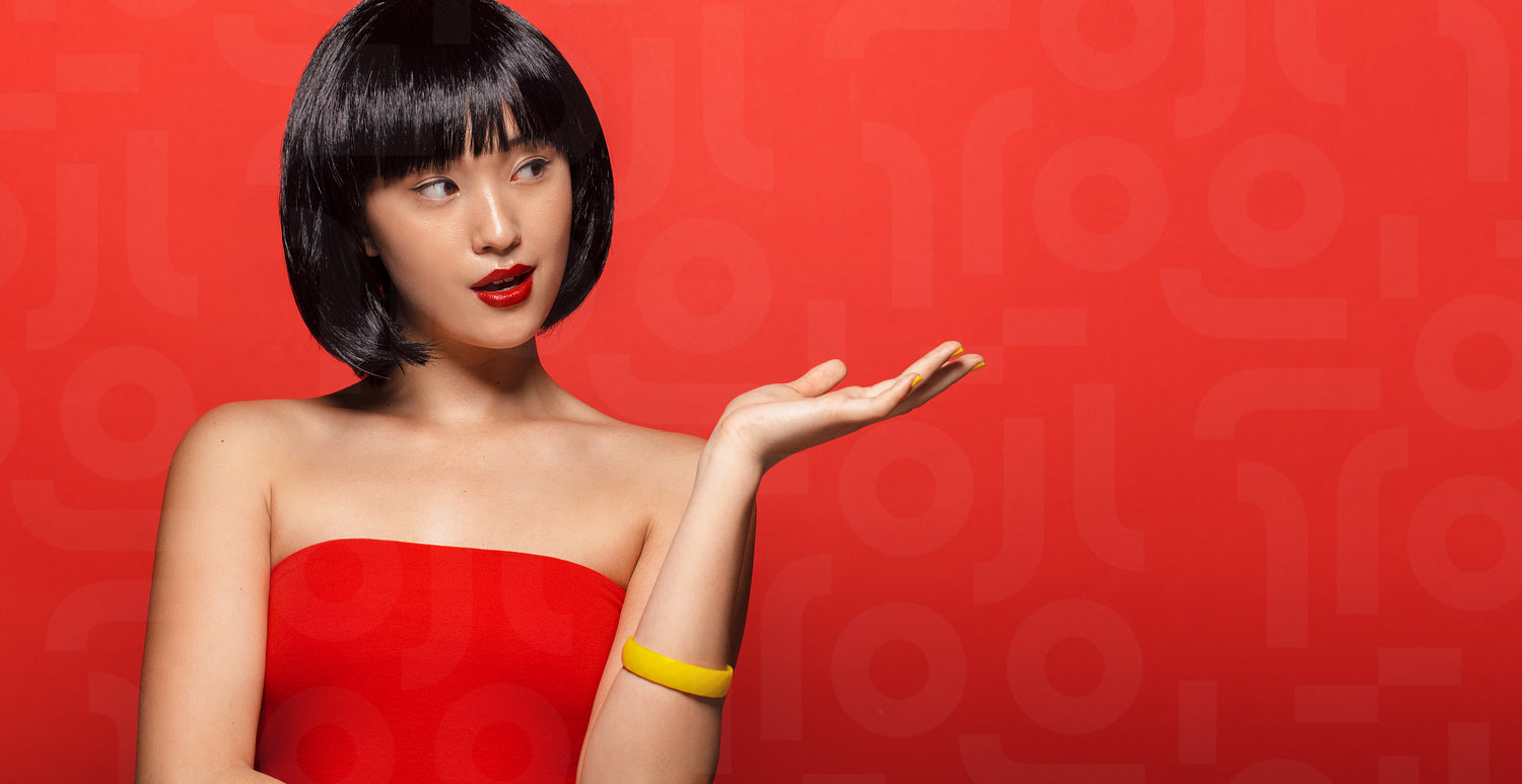 Portrait of attractive young asian woman with short hair pointing at copy space. Stylish female model showing you a product on red background.