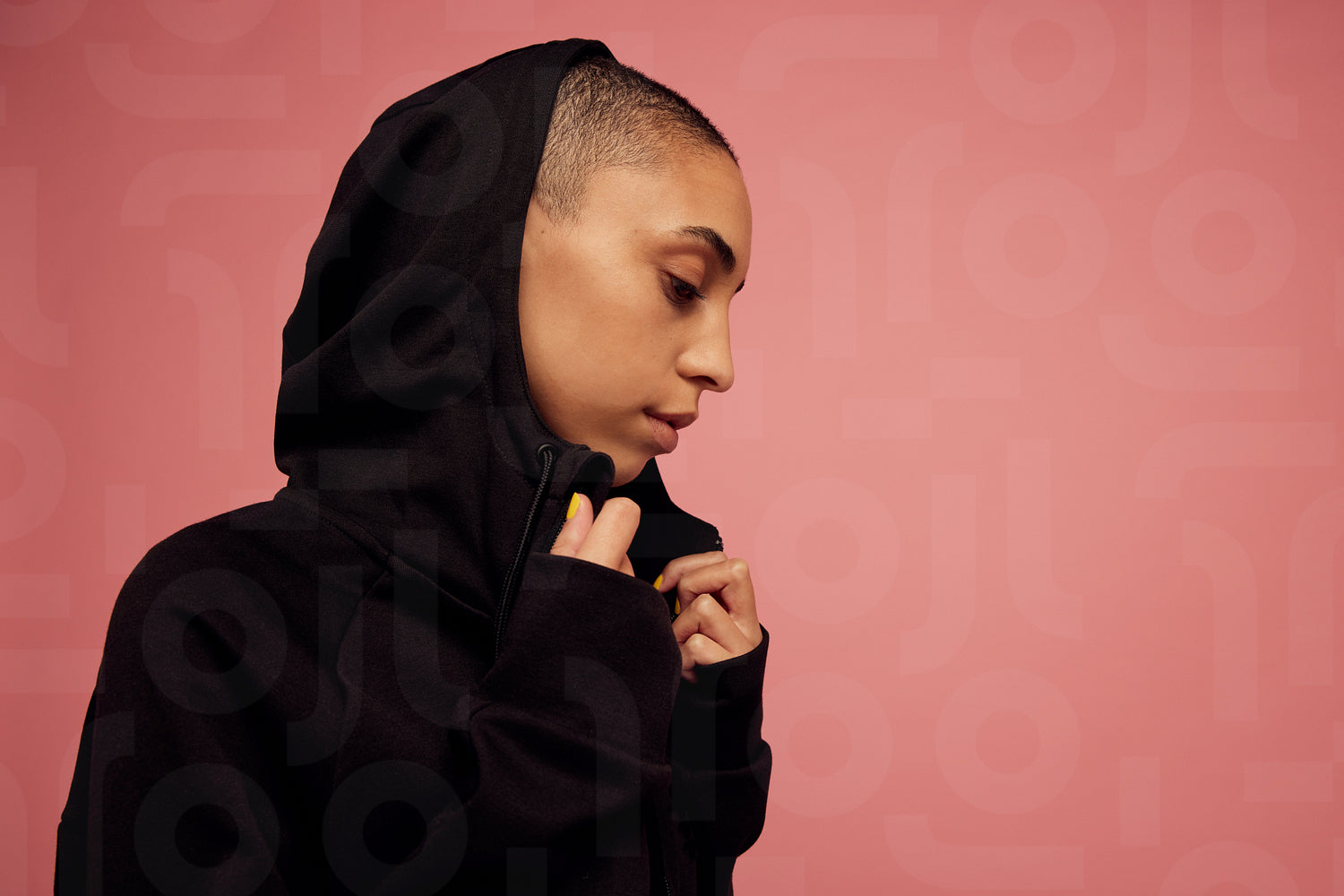 Gen Z female with shaved head on pink background. Androgynous woman in black hoodie.
