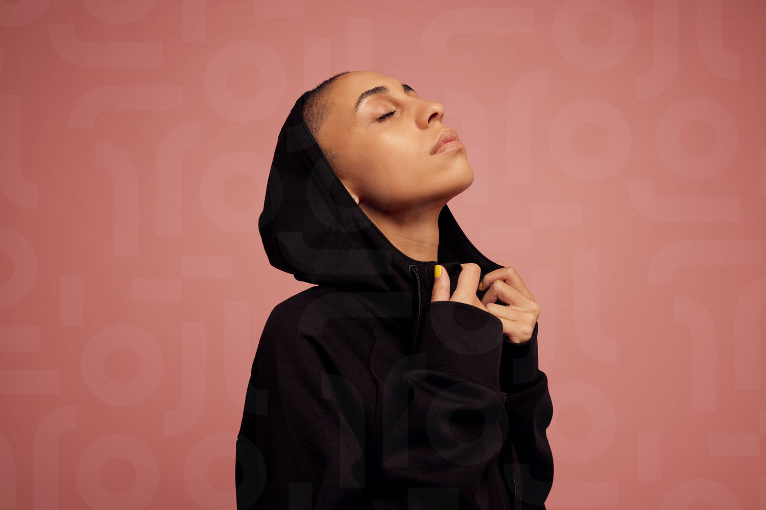 Shaved female wearing black hoodie jacket. Woman with bald head standing with her eyes closed on pink background.