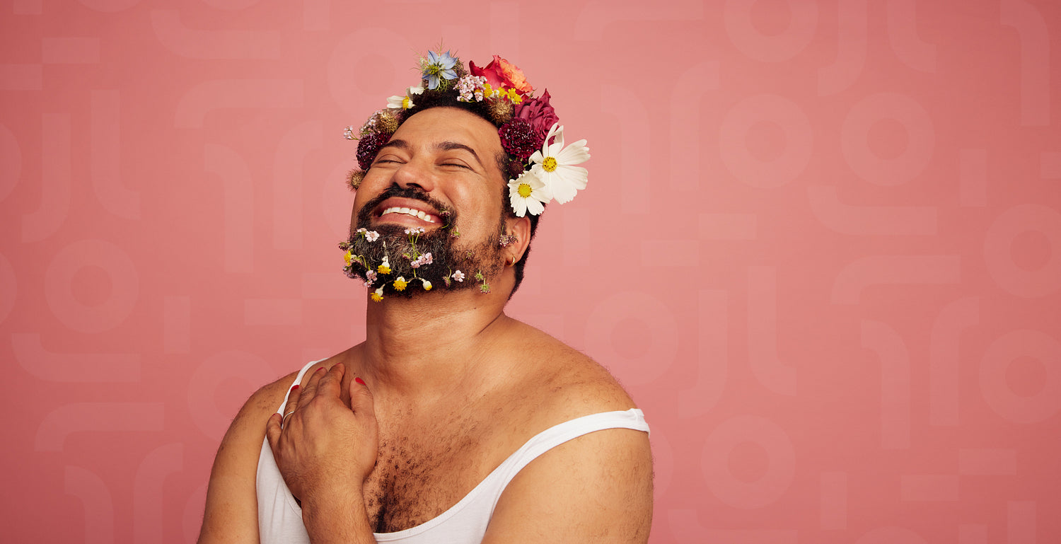 Genderqueer smiling on pink background. Gay man wearing makeup and flowers on head and beard with copy space.