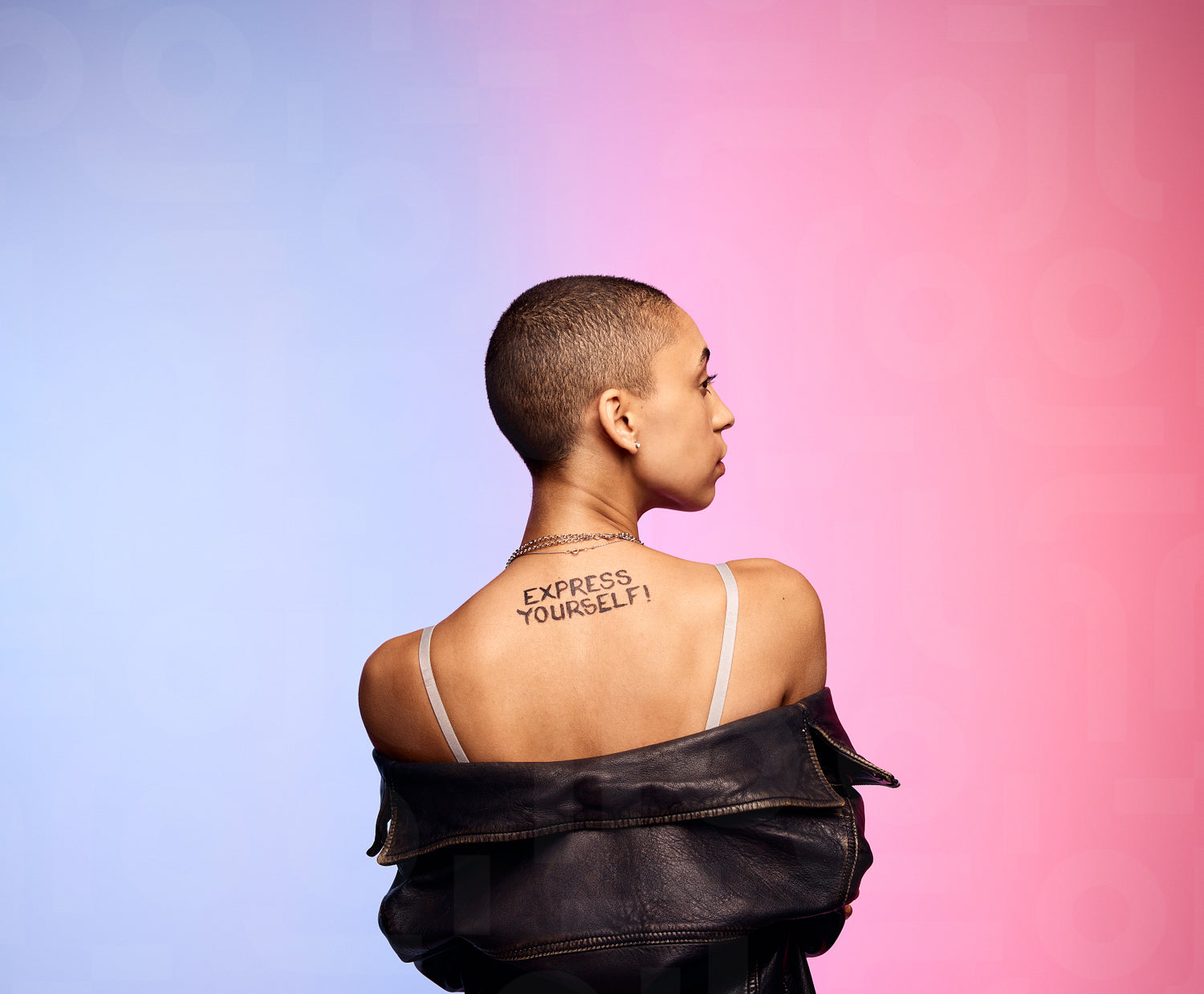 Rear view of bald woman on colorful background. Androgynous with short hair and express yourself written on back.