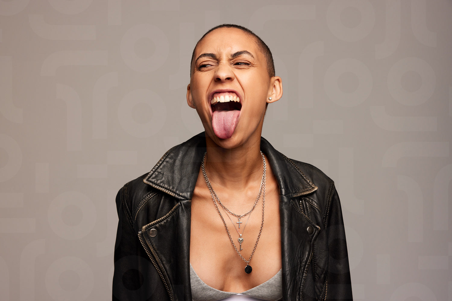 Portrait of a androgynous female wearing black leather jacket. Woman with shaved head sticking out her tongue and looking away.