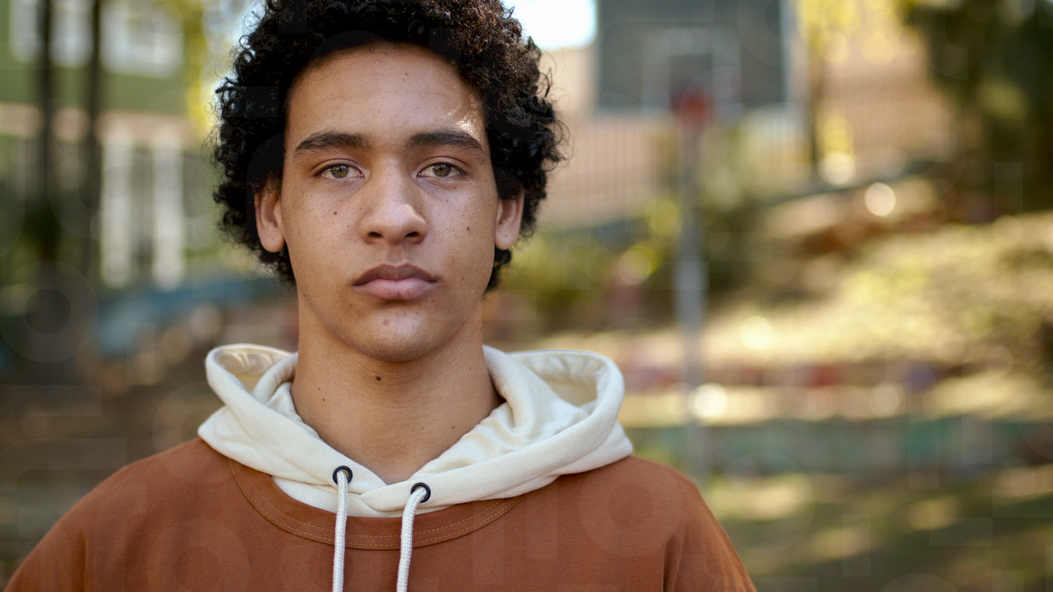 Closeup of a teenager staring at camera. Boy in causal wear standing outdoors.