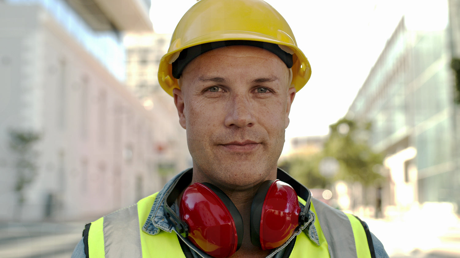 Portrait of a confident man working at construction site in the city. Male builder wearing protective workwear looking at camera.