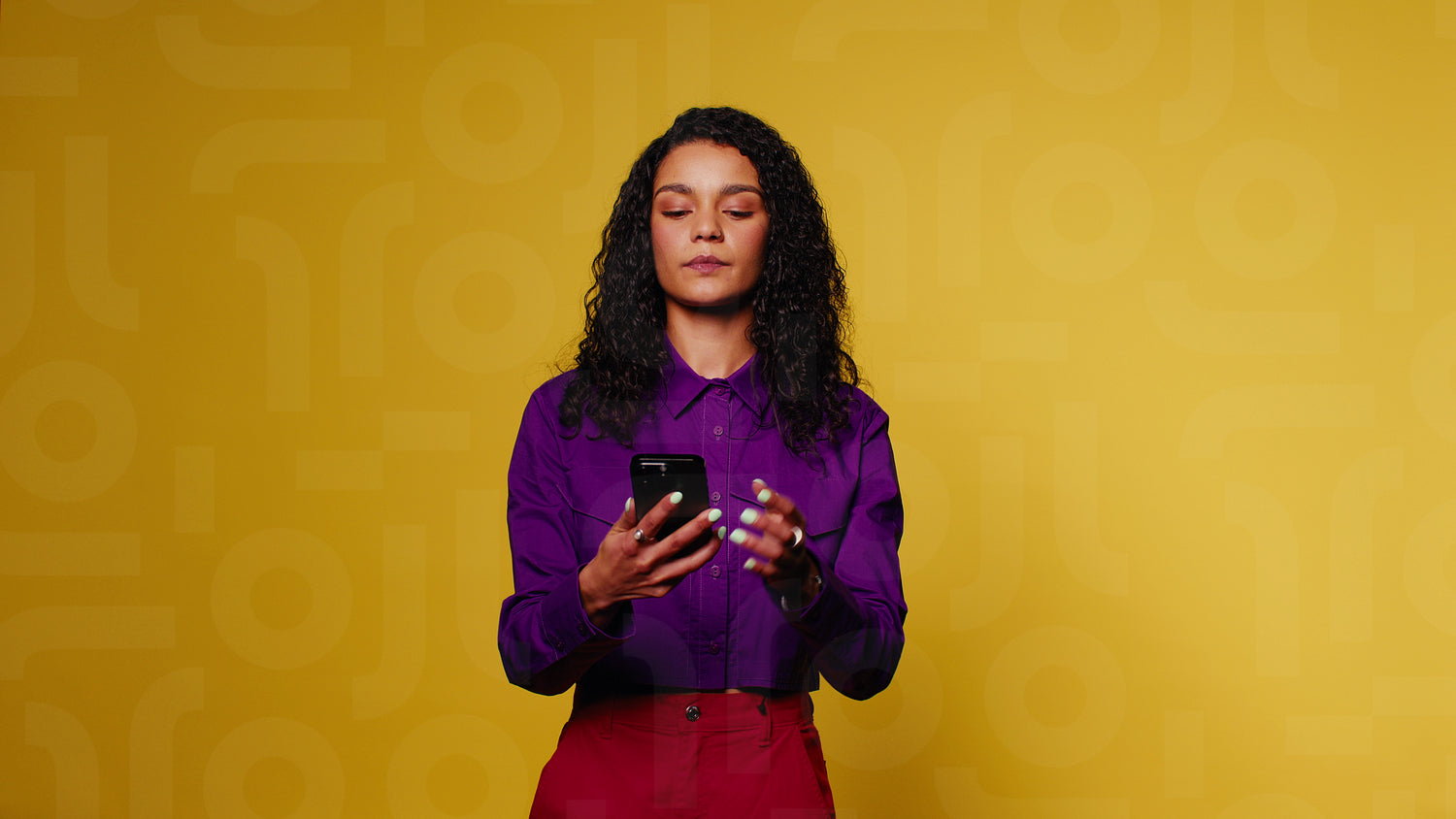 A young man and woman look at their phones and smile. They're texting each other and standing against colorful backdrops in a medium, vertical shot.