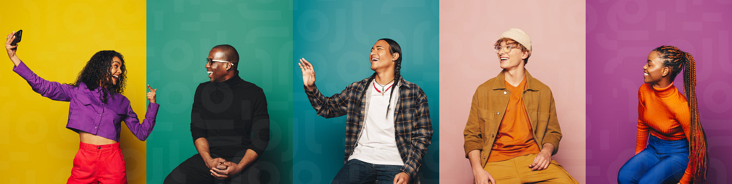 A group of diverse young adults engages in fun, capturing selfies and laughing together in a colorful studio setting creating a lively and engaging atmosphere.
