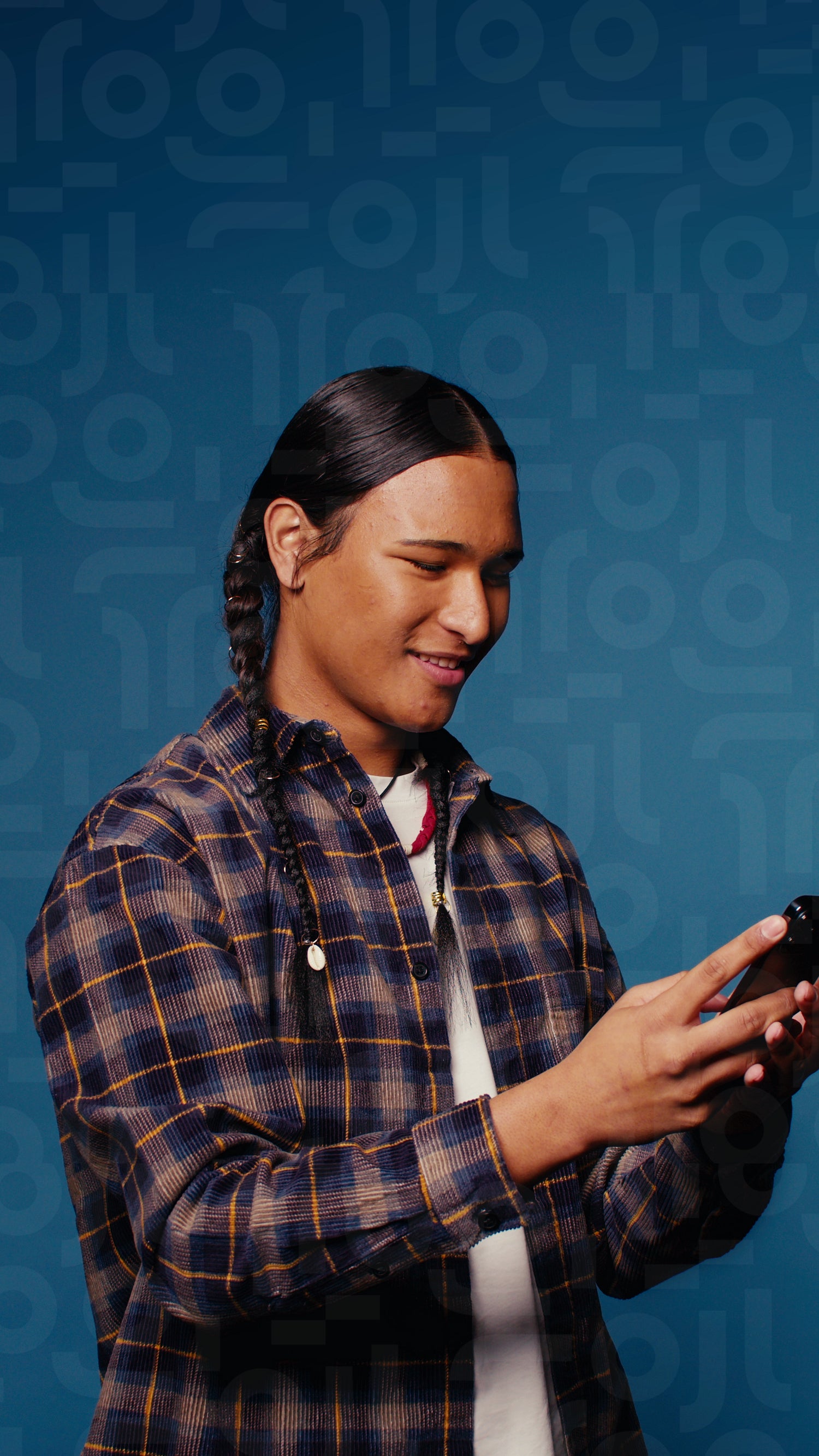Young man smiles and uses a phone against a blue background. He takes a selfie, texts, and scrolls. Medium close-up, vertical video.