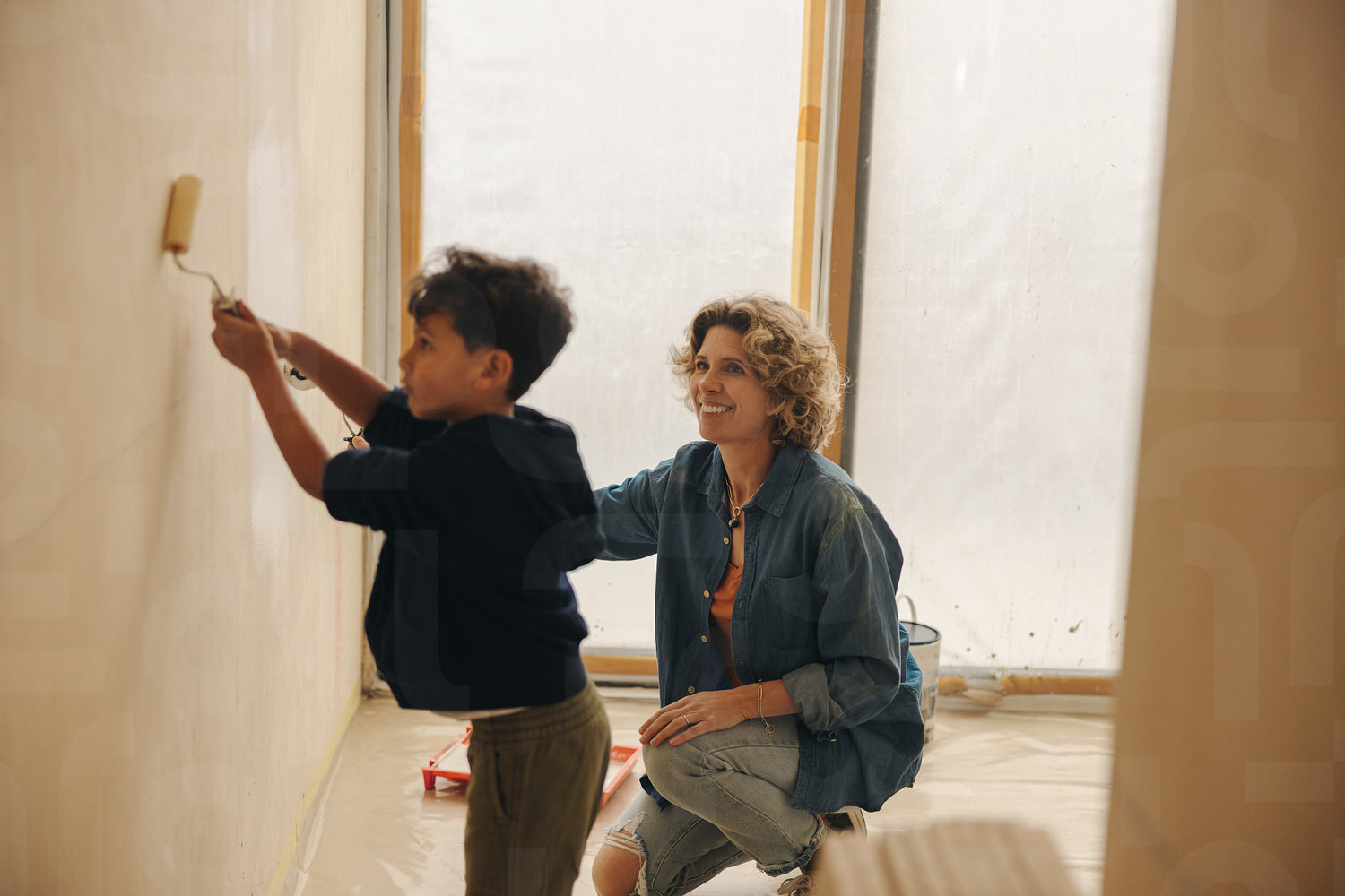 Mother creating family memories with her young son, watching him paint a wall in their house. Happy mom and son showing their creativity and love for DIY home renovation.