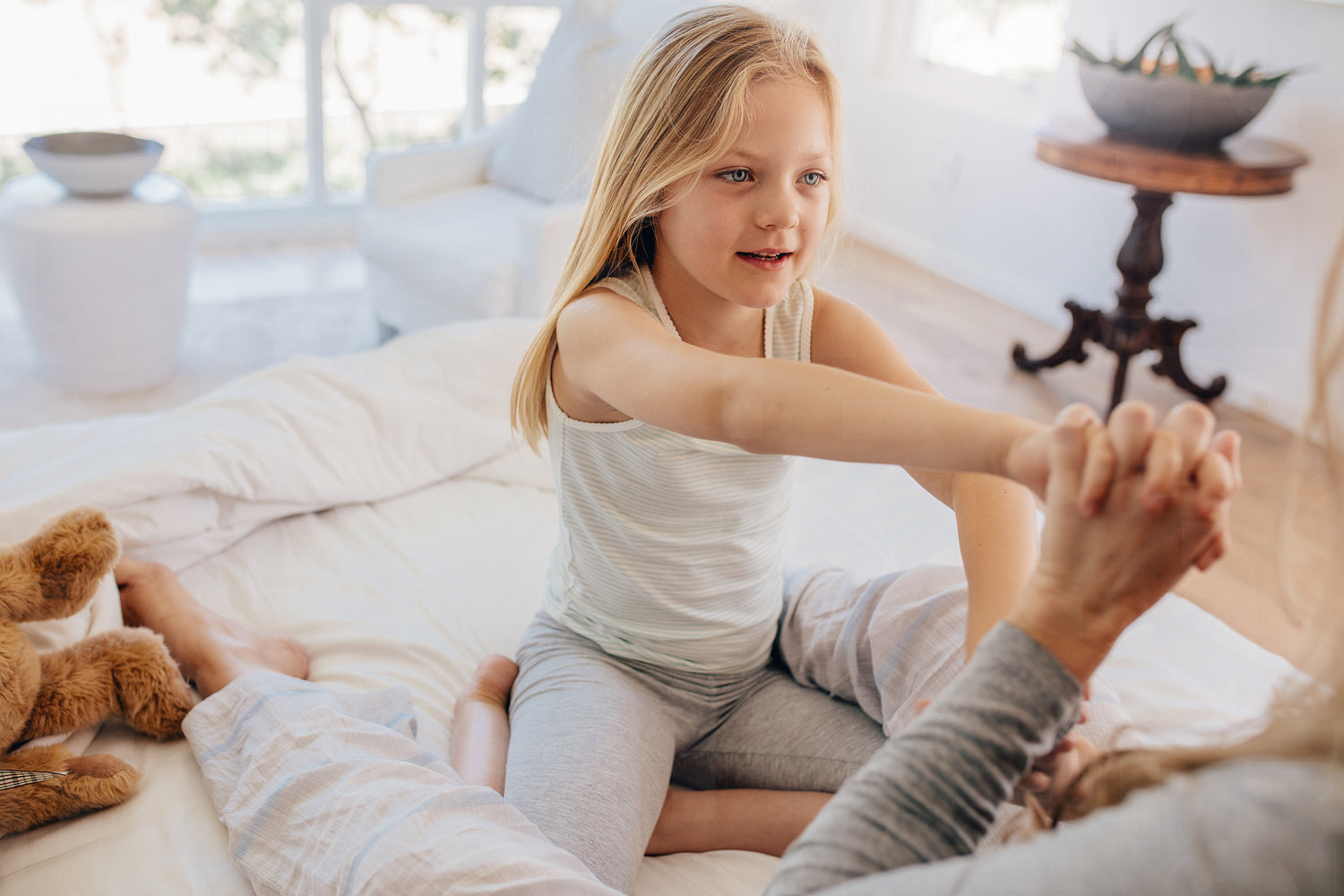 Beautiful little girl with her mother on bed. Cute daughter playing with her mother in bedroom.