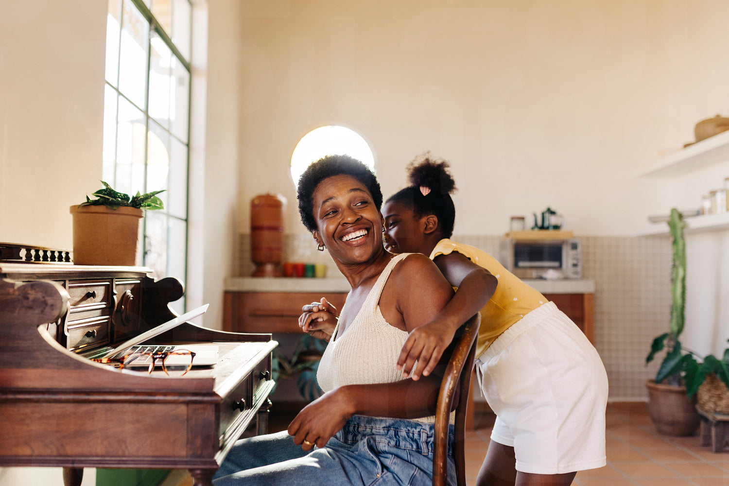 Brazilian family bonding at home. Mother and daughter embrace and smile, showcasing their authentic and playful relationship. This candid moment captures the happiness and work-life balance of a working mom.