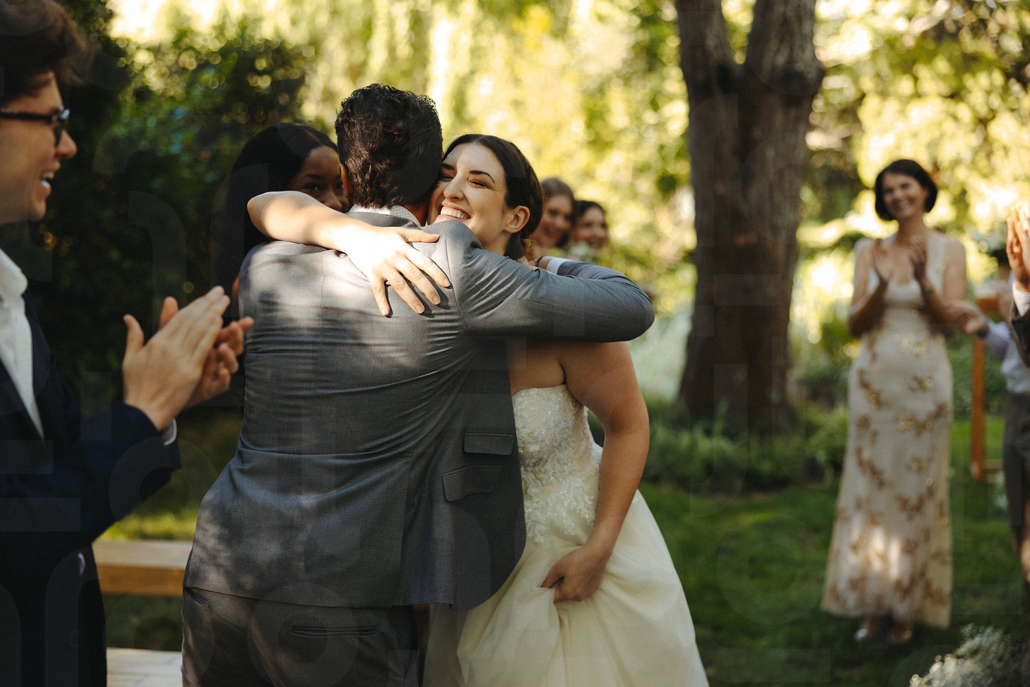 A cheerful bride embraces a guest during an outdoor wedding celebration surrounded by loved ones.