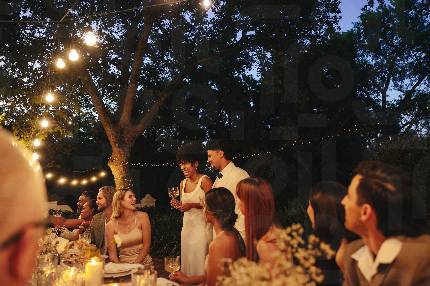 Celebration of a romantic evening wedding dinner under outdoor lights with friends