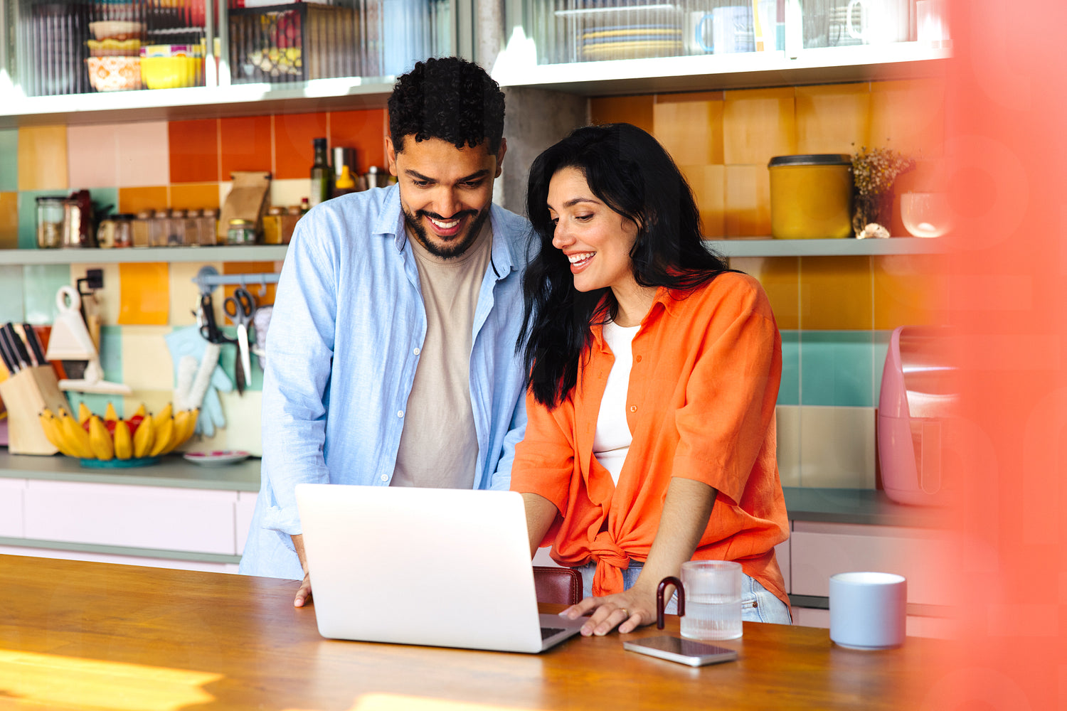 A happy couple collaborating on a laptop while enjoying time together in their colorful kitchen. The cheerful environment and devices around showcase a relaxed and productive domestic moment.