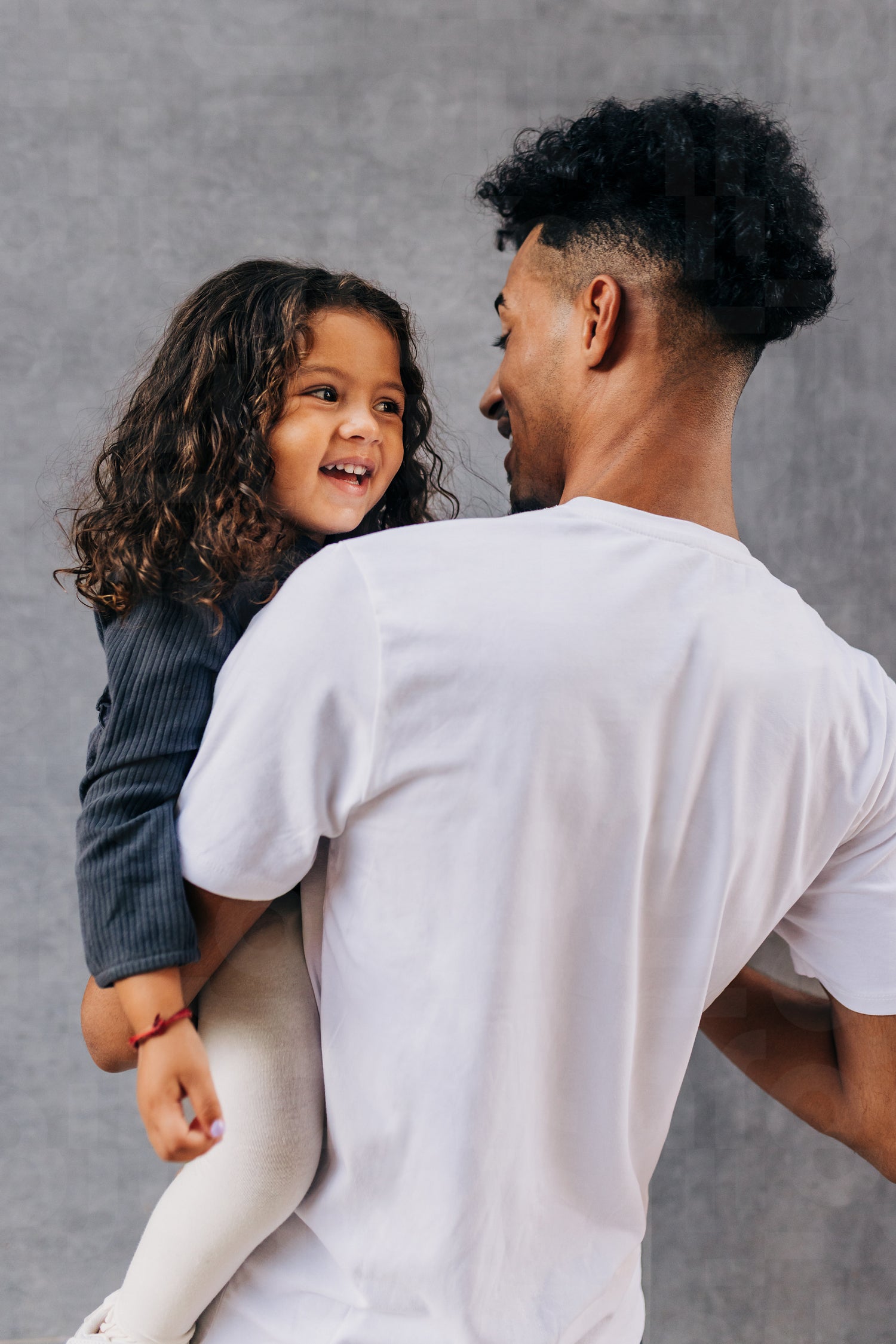 Rearview of a happy single father smiling at his daughter while carrying her in a studio. Cheerful young dad celebrating father's day with his adorable daughter.