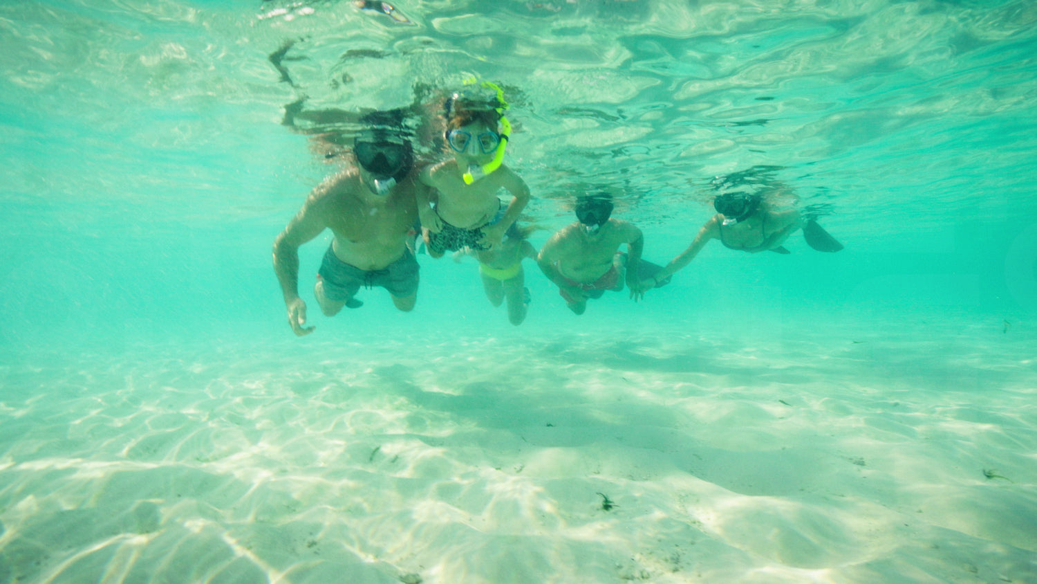 Family and friends snorkeling in crystal clear blue ocean water during a tropical vacation