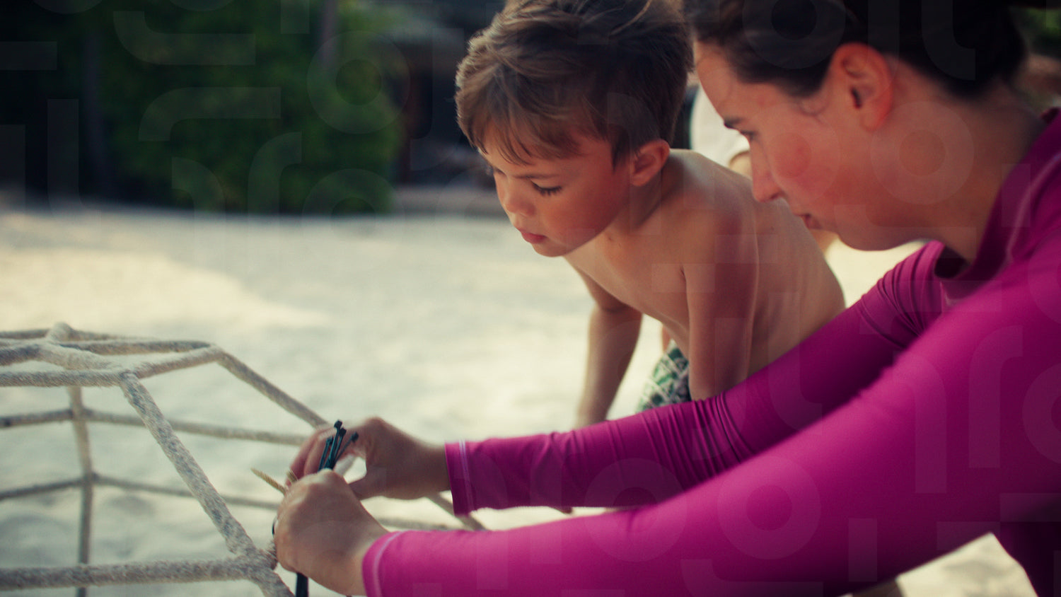 A diverse group of family and volunteers collaborate on a beach, working together on a coral propagation project. They demonstrate environmental conservation, sustainability, and community effort.