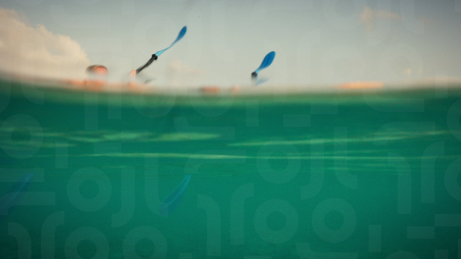 A family paddles transparent kayaks across crystal-clear tropical waters. The unique half-underwater, half-above-water perspective reveals marine life and the beauty of an island vacation at sunset.