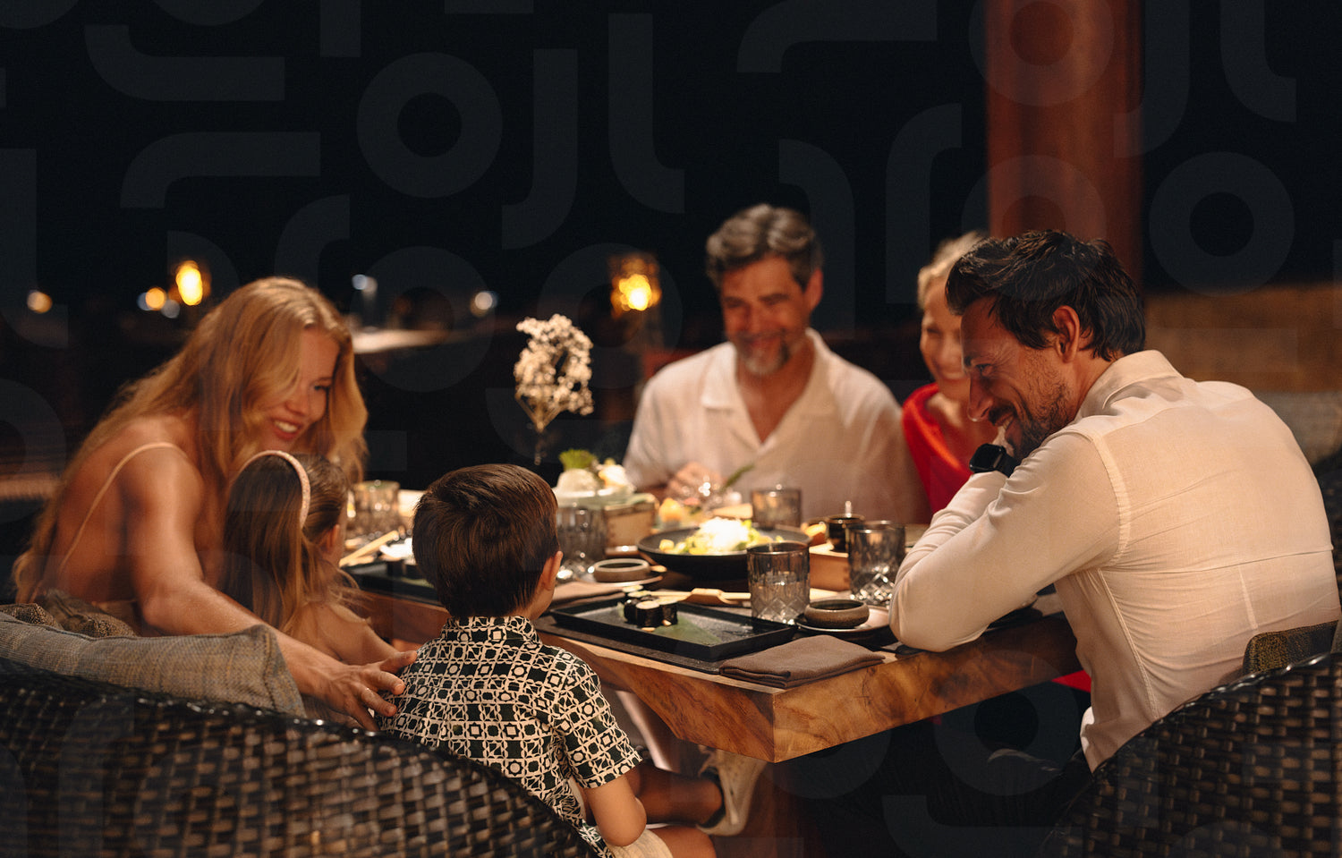 A family of multiple generations gathers around a table enjoying a special dinner occasion.