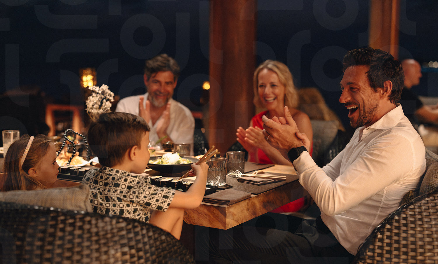 Family enjoying a joyful dinner together at a luxury restaurant setting