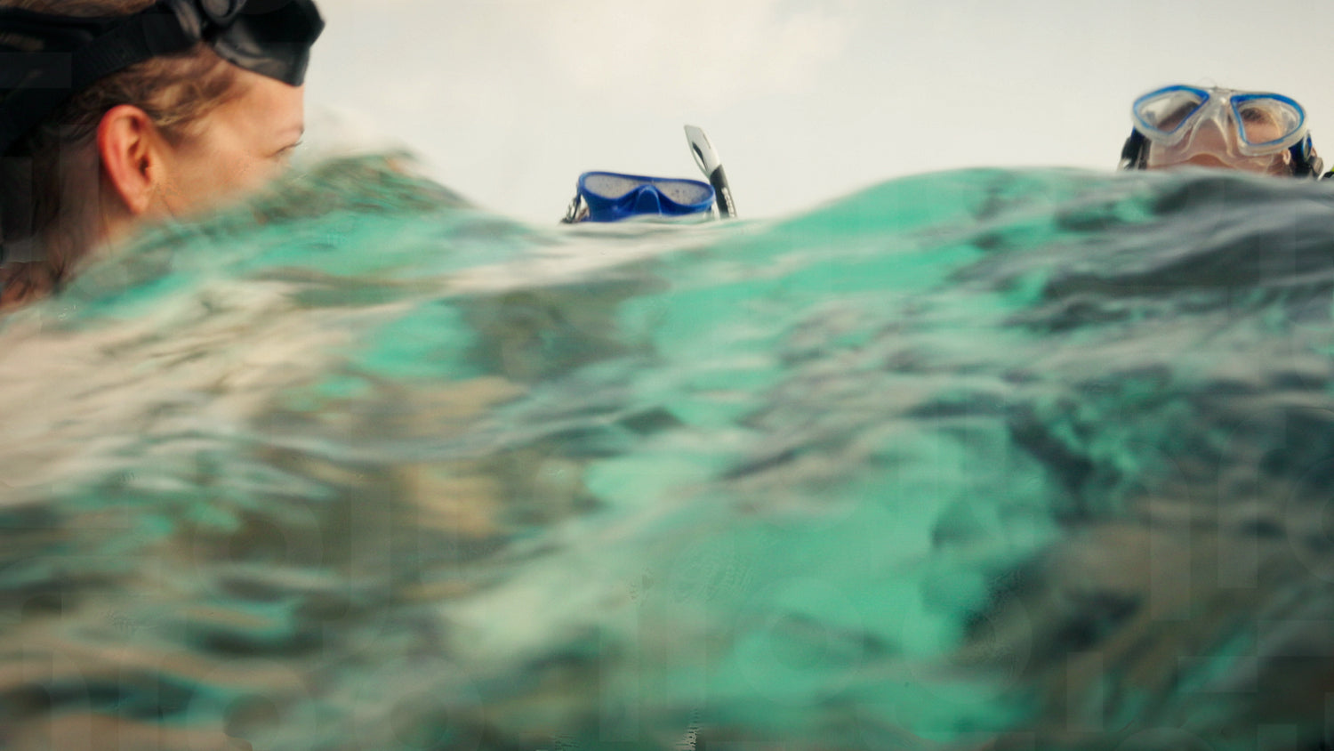 A vibrant, split-level view captures a joyful family snorkeling in pristine tropical waters. Their happy faces and clear masks reflect a perfect summer vacation filled with fun and relaxation.