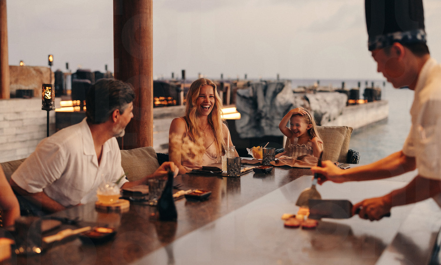 Family enjoying teppanyaki dinner at a seaside gourmet restaurant