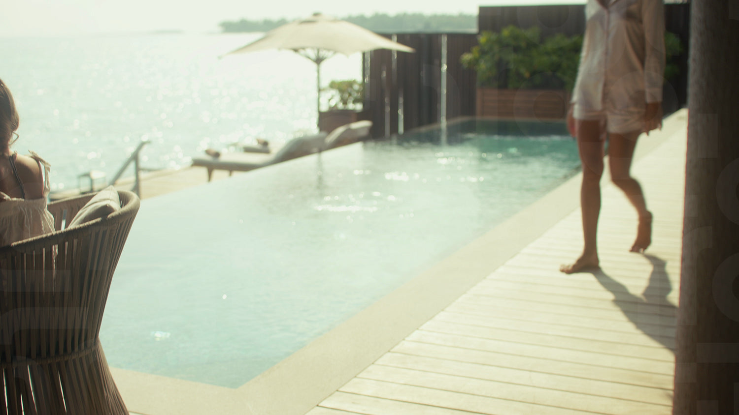 Family enjoying breakfast on an overwater villa patio, a mother and daughter sharing a beautiful morning meal with tropical drinks by the private pool overlooking the ocean