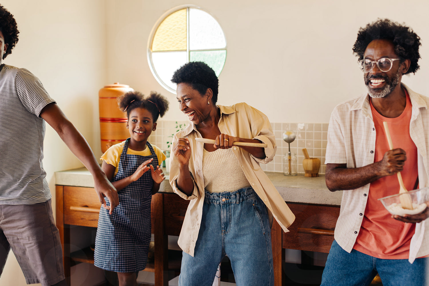 Mature parents and their two children dance and laugh together while baking in their home kitchen. Happy Brazilian family having fun as they mix flour and ingredients in a bowl.