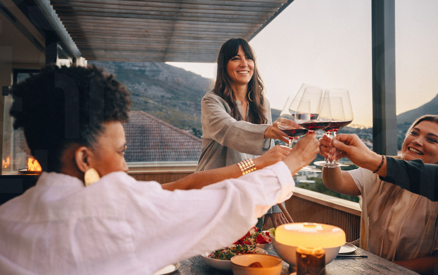 Group of friends toasting wine glasses on a terrace during sunset