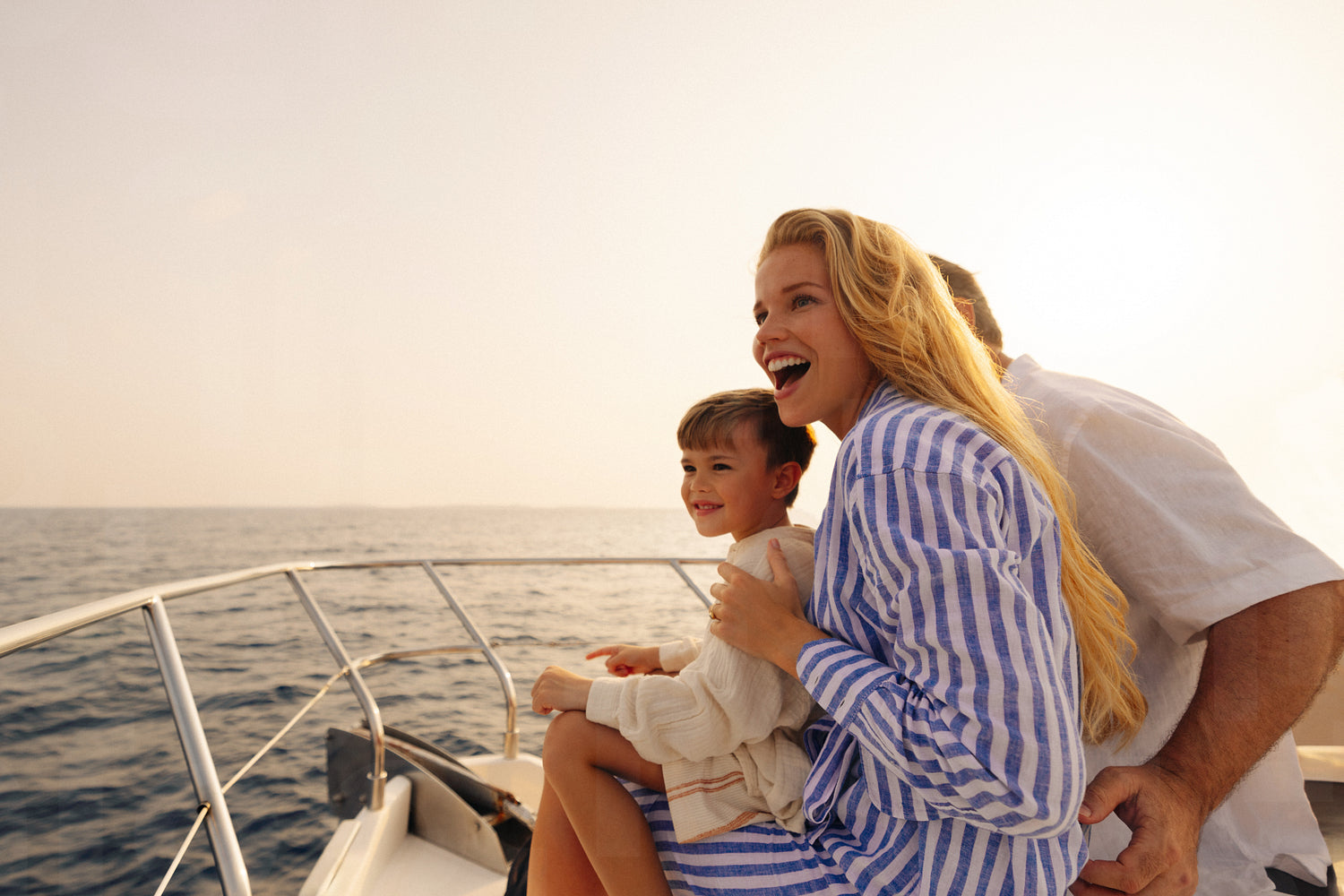A joyful family sailing on a boat, enjoying a holiday together. They laugh and embrace the adventure of the open sea under the warm sun.