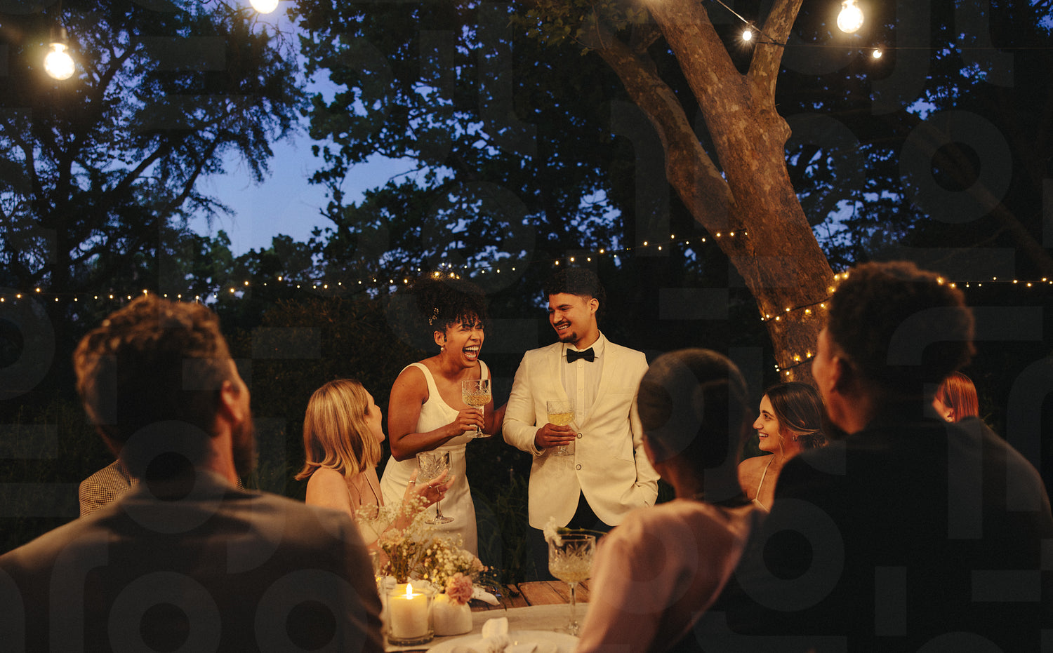 An intimate evening garden wedding with the couple toasting at a warmly lit table surrounded by guests.