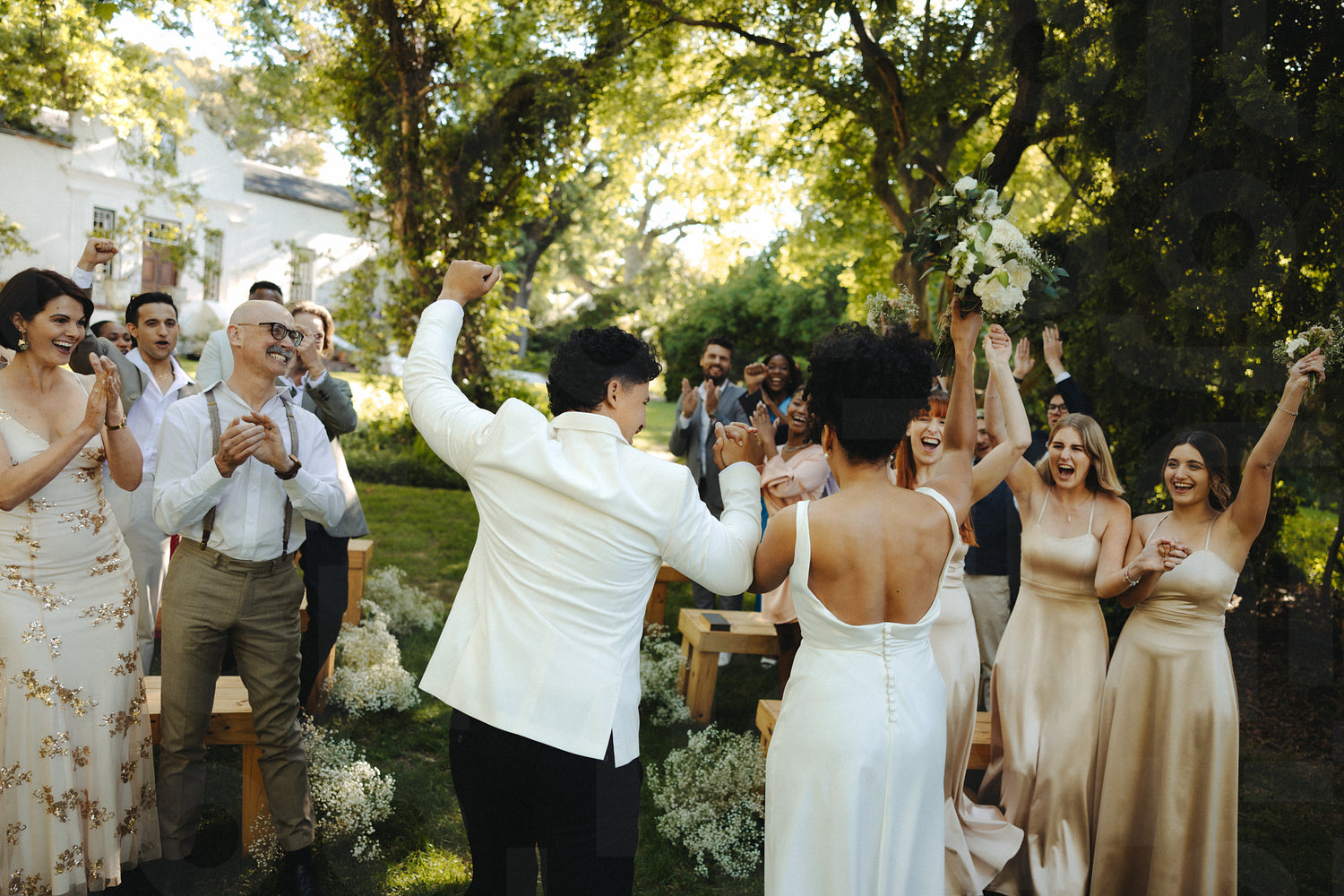 A vibrant outdoor wedding ceremony with guests expressing joy and love, celebrating together.