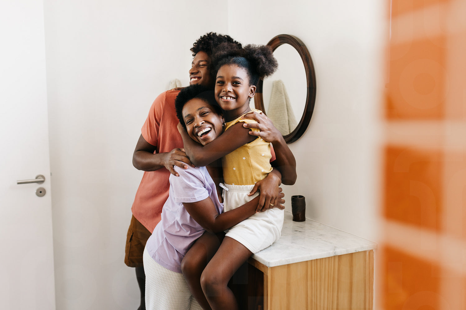 Mom hugging her son and daughter at the bathroom sink, smiling happily