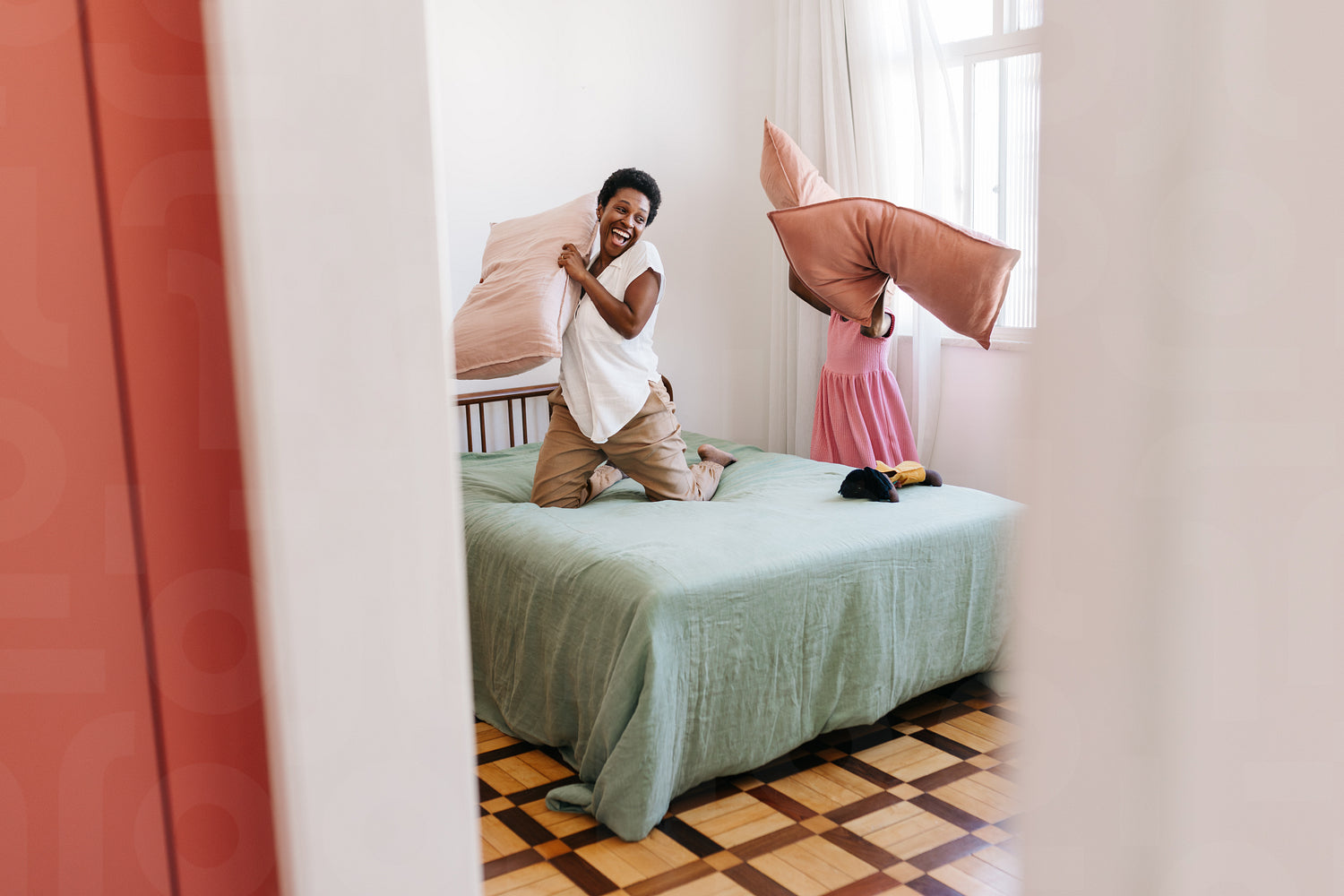 Playful mother and daughter having fun with pillows in a bedroom