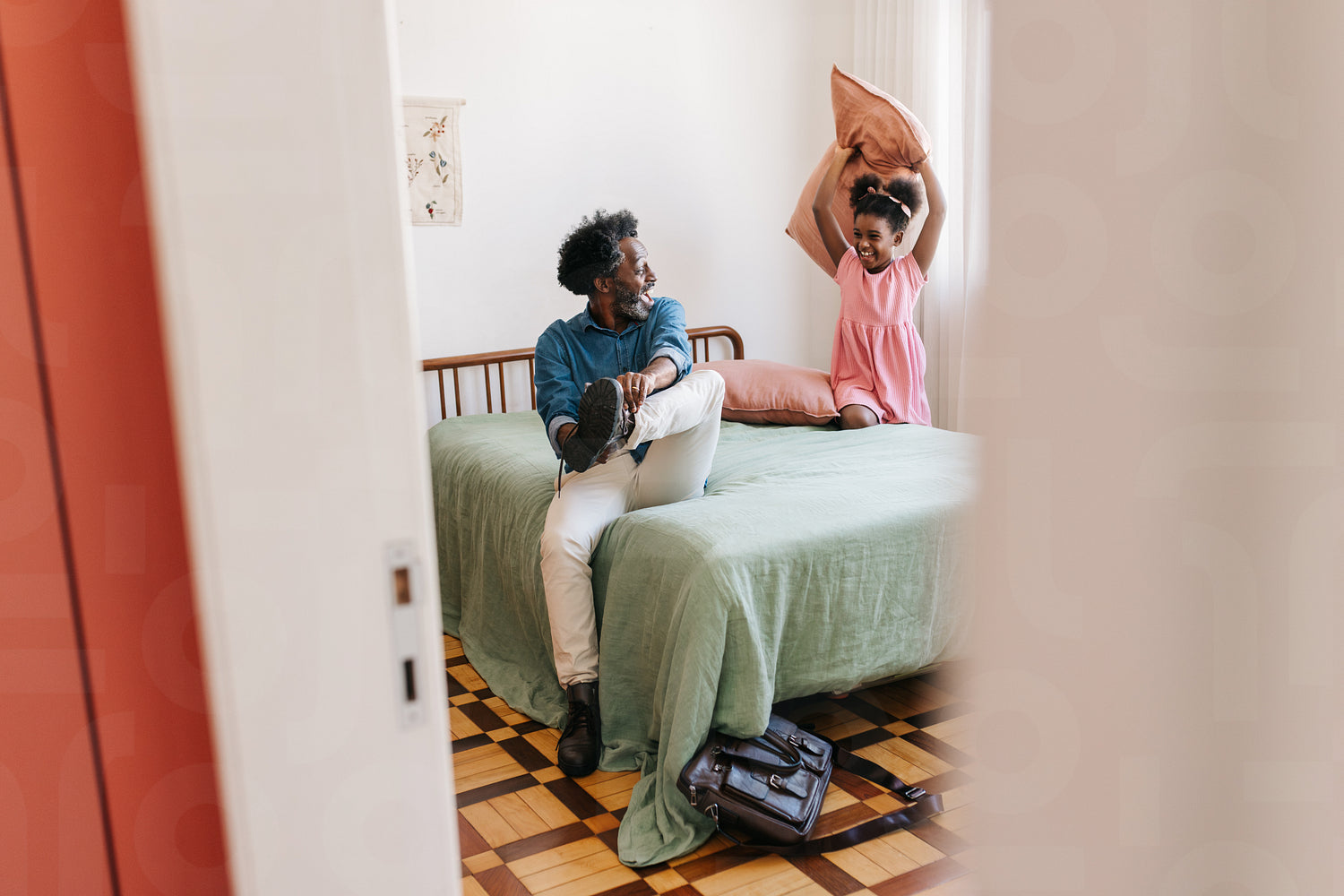 Mature dad takes off his shoe as his daughter waits for a pillow fight. Happy single father returning home to a cheerful, playful and fun-loving daughter after a long day of work.