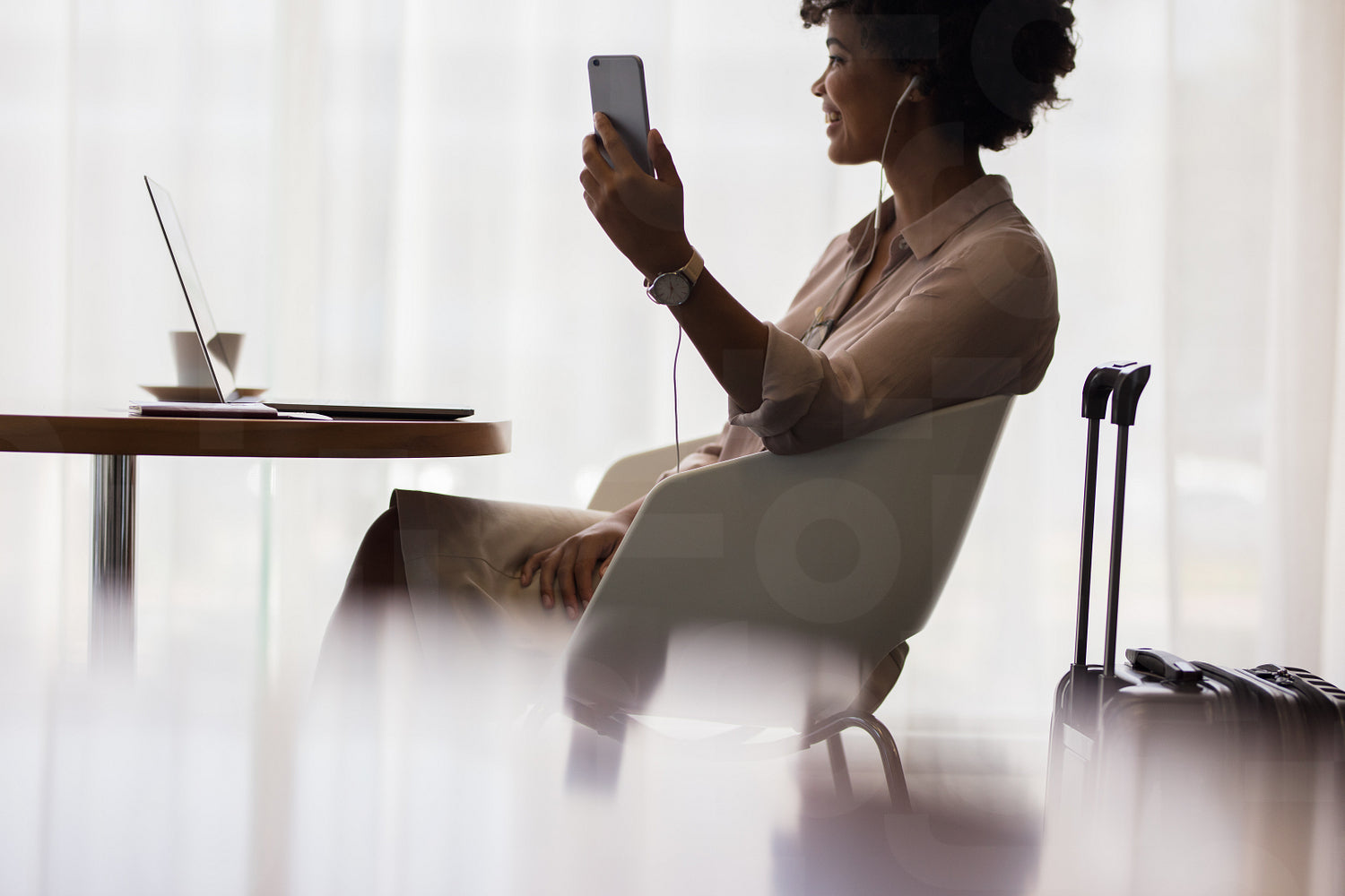 Happy woman making video call from mobile phone while sitting at airport lounge. Business woman waiting for flight at airport and using smart phone.