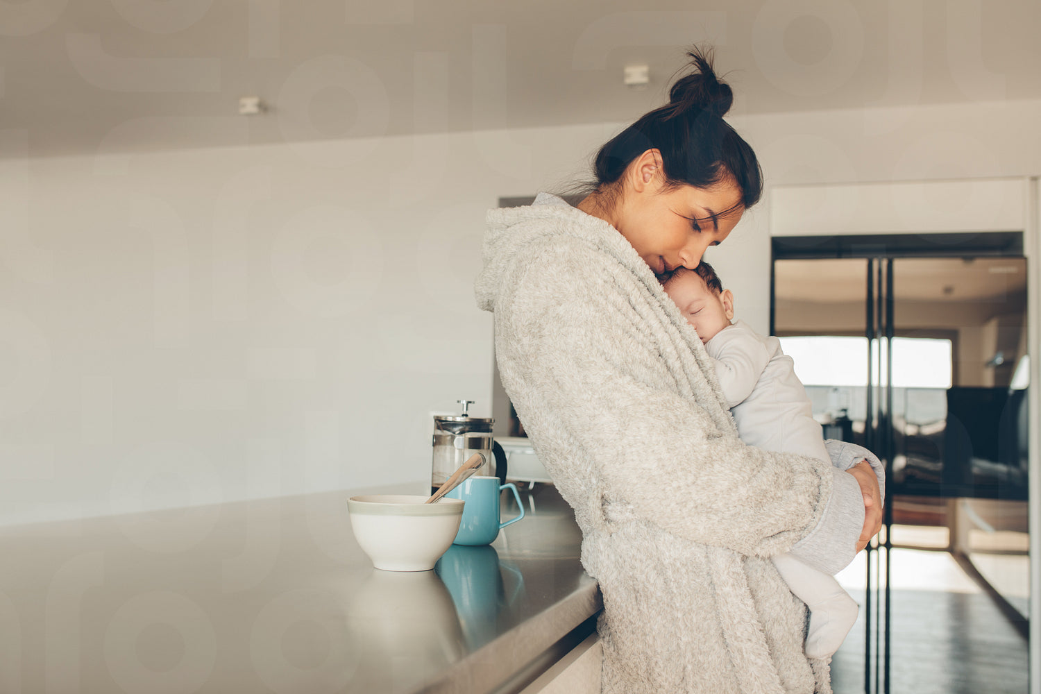 Woman in bathrobe holding her son in kitchen at home. Newborn baby boy sleeping in his mother's hands.