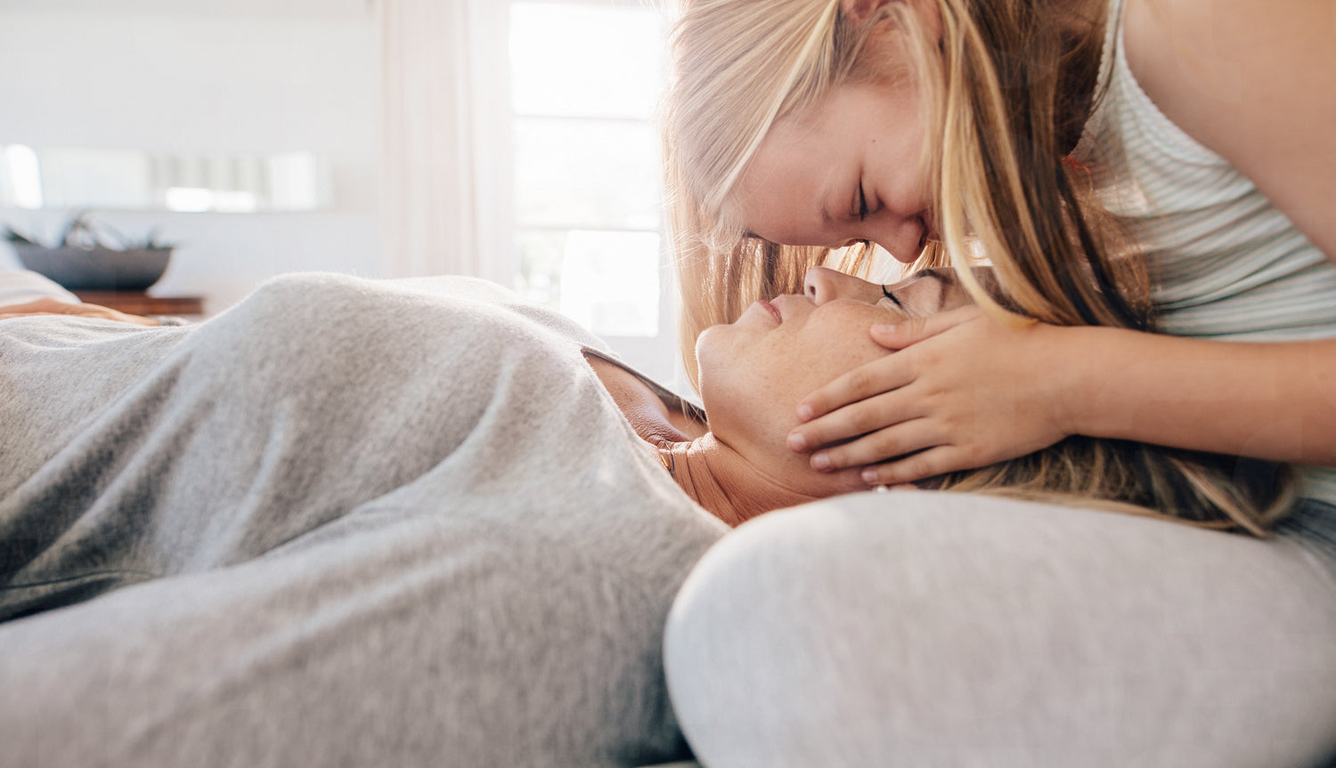 Woman sleeping on her daughter's lap. Little girl sitting with her mother sleeping on bed at home