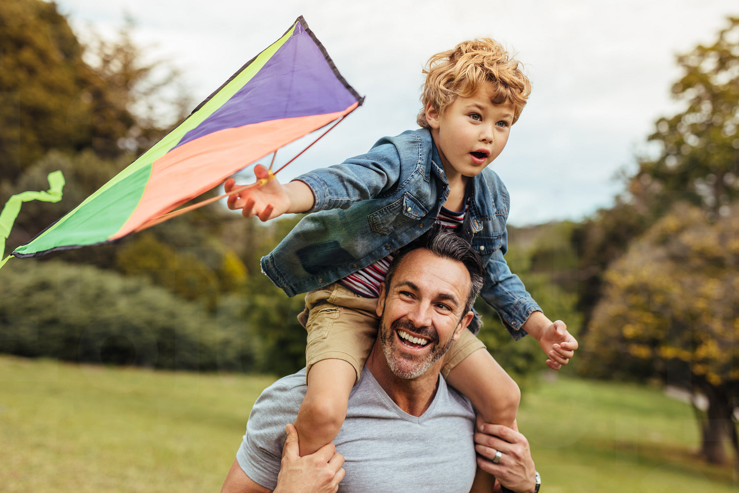 Little boy holding a kite sitting on his father's shoulders at the park. Happy father and son flying kite outdoors.