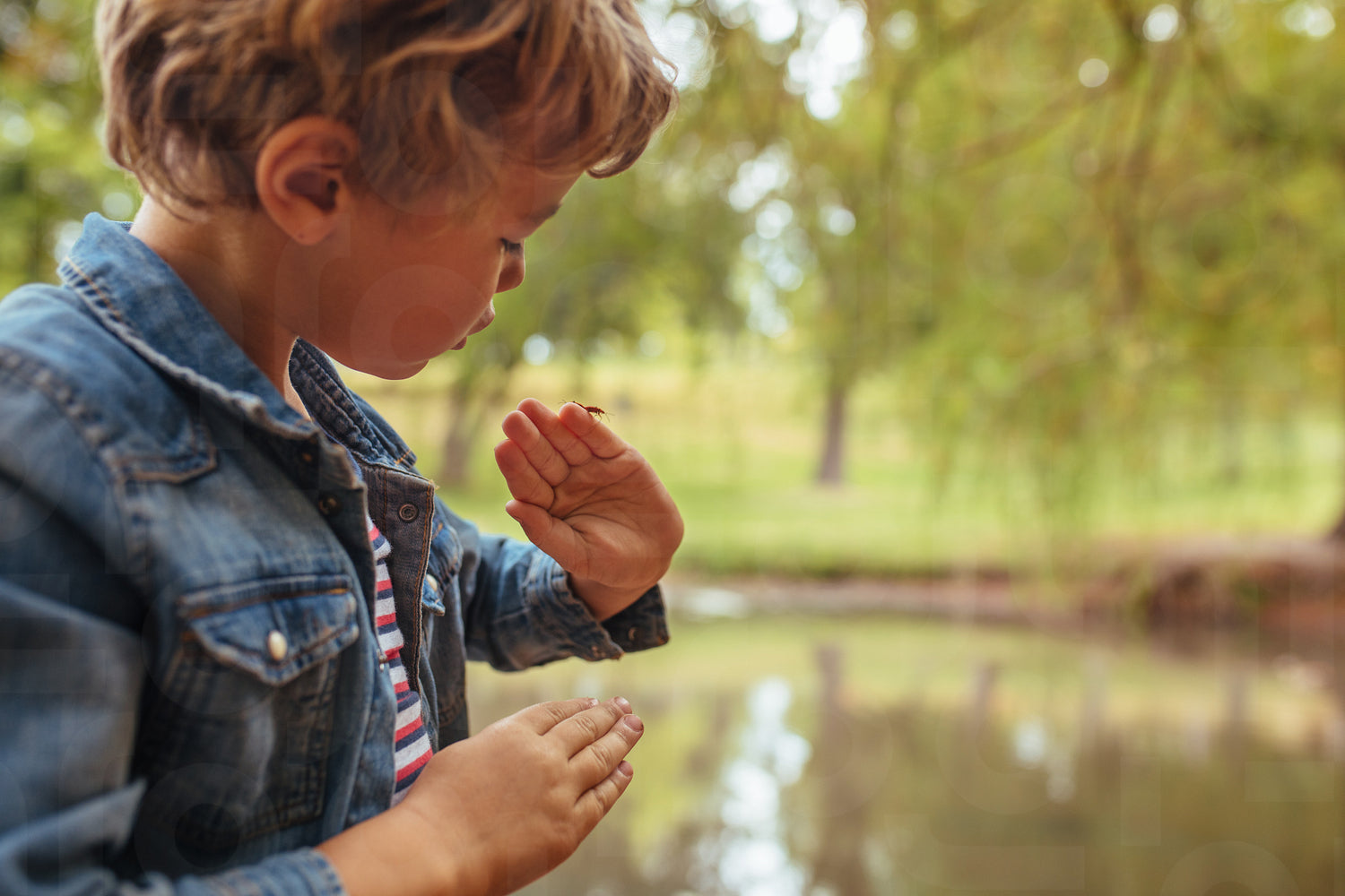 Little boy looking at an insect on his hand while standing by a pond in park. Small kid admiring an insect in his fingers.